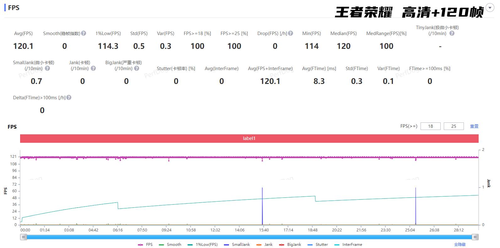 30分钟/高清+120帧。实测平均120.1帧(图2),看着可能和别家没太大差别,但要注意GT8 Pro的1% Low帧也有114.3帧,也就是连微小卡顿都很少有。而且平均功耗也只有2.52W,属于相当低的水平。