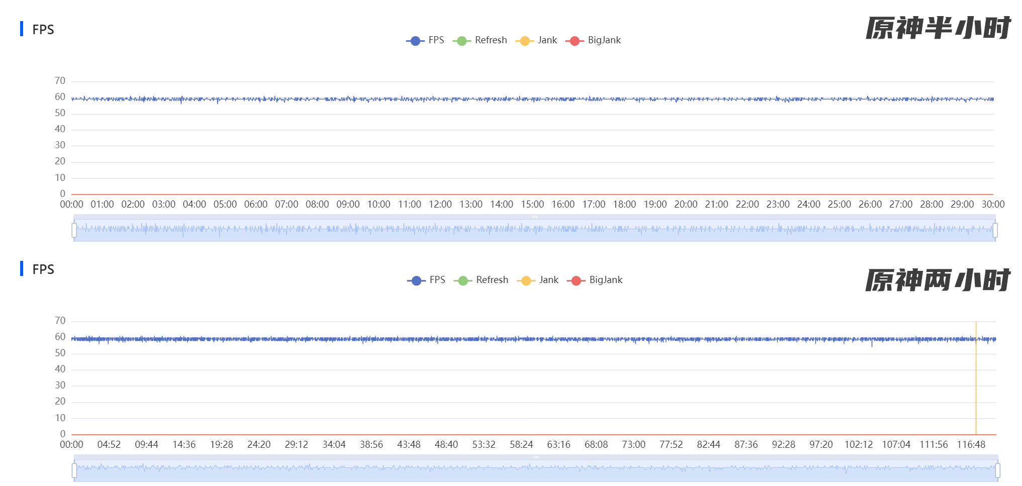 极高画质+60帧,半小时/两小时。平均59帧,仔细看帧率(图4),就算是两小时这种长时间高负载,后半程依然没有太大波动,全程没降频、没锁帧,温度控制也不错。