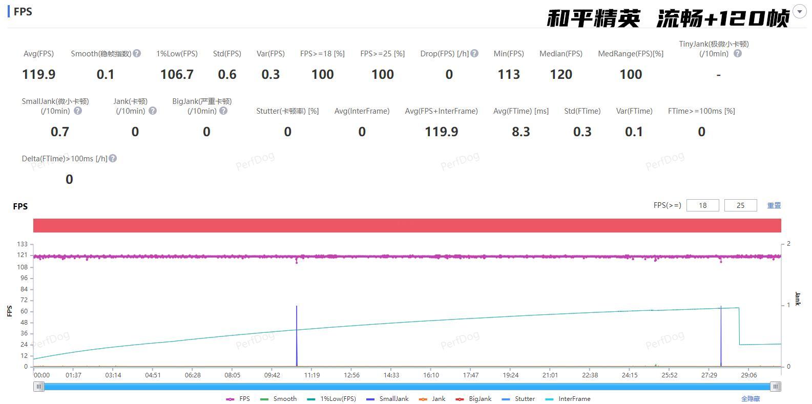 30分钟/流畅+120帧。和王者类似,平均119.9帧(图3),106.7的1% Low帧也很高。而且因为用上了更奢侈的2K 144Hz苍穹屏,吃鸡还原生支持144fps,特别大角度、快速的移动和瞄准,能明显感觉更丝滑流畅。