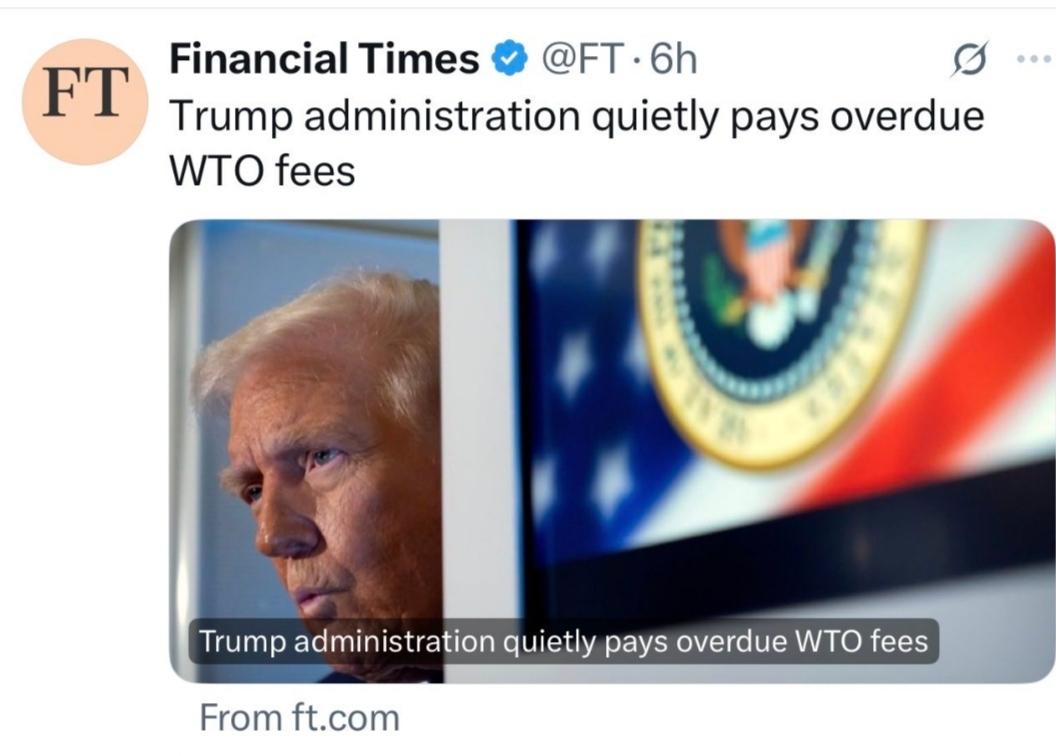 特朗普是个“纸老虎”?! 昨天世贸组织领导人称赞川普有些贸易战做法是对的。今天金融時报就把原因给揭晓了。 原来已特朗普悄悄补缴了了欠世贸组织的会费。 特朗普外表的咋咋呼呼,他的内心也有非常脆弱的一面。对中国开始恶狠狠的挥舞关税大棒,但一正面交手,他的言行也就软塌。