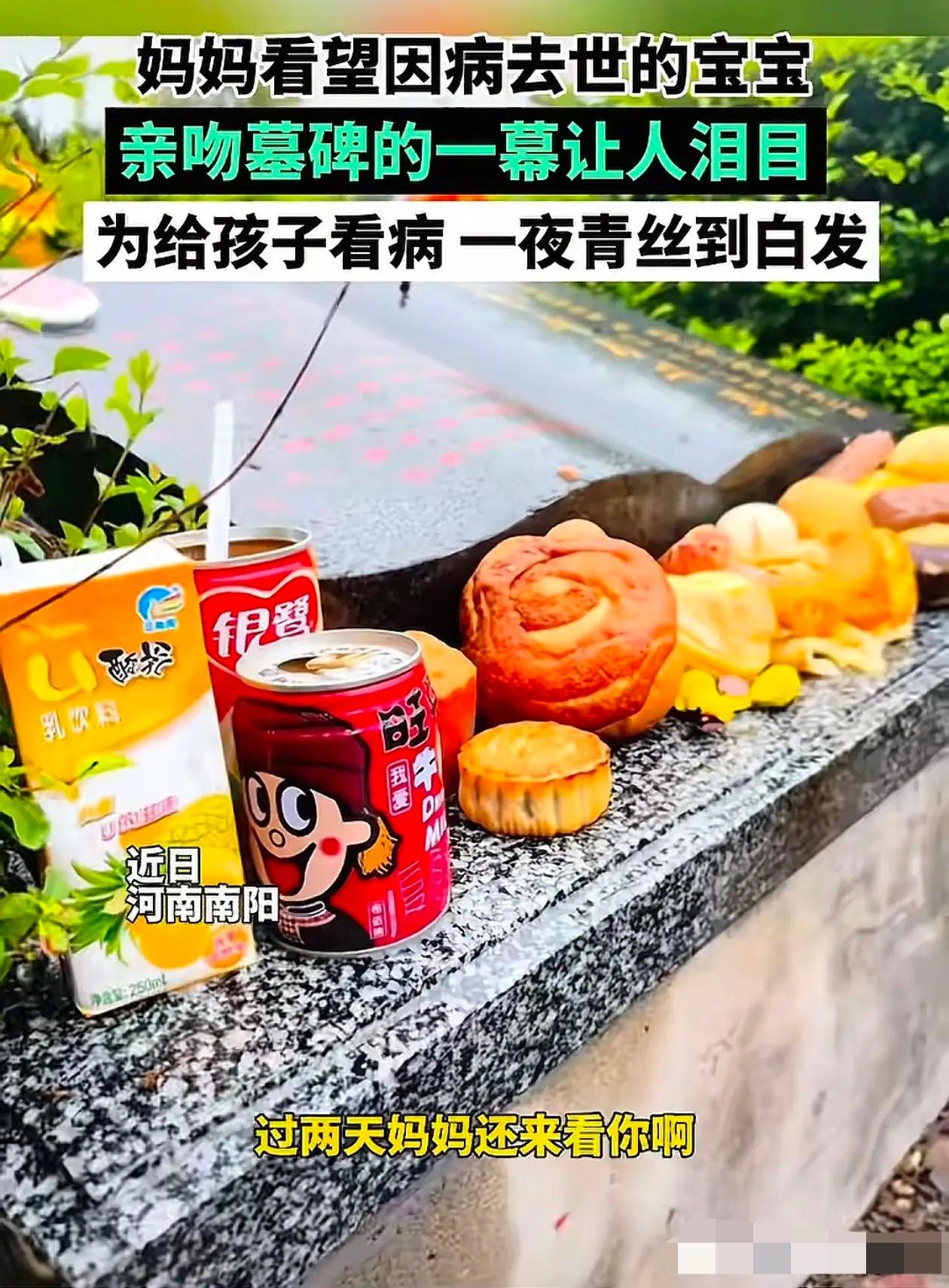 这是我见过最执着的妈妈!河南,一位34岁满头白发的女子,近2年来无论天晴下雨,从不间断,总是会独自来到墓地看望去世的孩子,每次来一待就是小半天,对着墓碑说好多话。 今天的风裹着土味,她蹲在碑前,把刚洗好的草莓摆成小堆。指尖蹭过碑上孩子的名字,声音轻得像絮语:“今天学校门口的花开了,跟你小时候戴的发夹一个颜色。” 旁边扫墓的大娘叹着气走开,说这姑娘才三十多,头发白得比六十岁的人还厉害。她听见了,也只是抬手理了理鬓角,没抬头。 雨丝突然飘下来,她摸出块布擦了擦碑面,接着说:“昨天我梦见你了,你说想吃我煮的面,回头我给你盛一碗端来。”雨珠砸在她袖口,洇出深色的印子。 有次同村的人劝她别总来,说总陷在难过里不好。她摇摇头,说“这是我跟孩子说话的地方,不来,他该孤单了”。话没说完,眼泪就砸在碑前的草叶上。 太阳偏西的时候,她才慢慢站起来,把空篮子挎在胳膊上。走两步又回头,对着墓碑挥了挥手:“明天我再来看你,给你带新摘的桃子。”风裹着她的声音,散在墓园的安静里。寒心如苦的妈妈