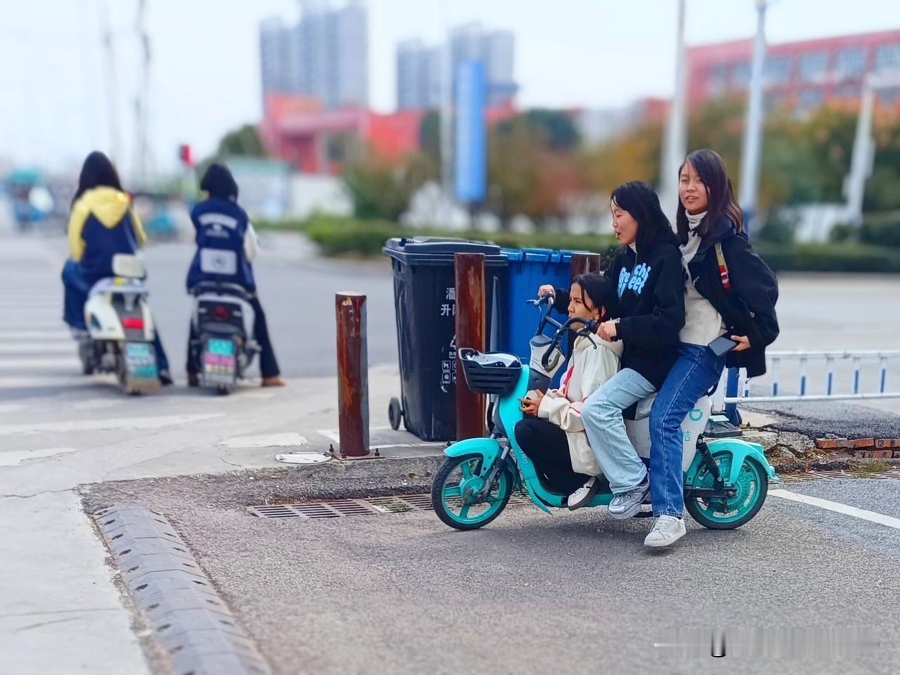 共享单车从很多城市退出了! 3女汉子如此共享1个弱车子~公司不亏本撤退才怪呢。