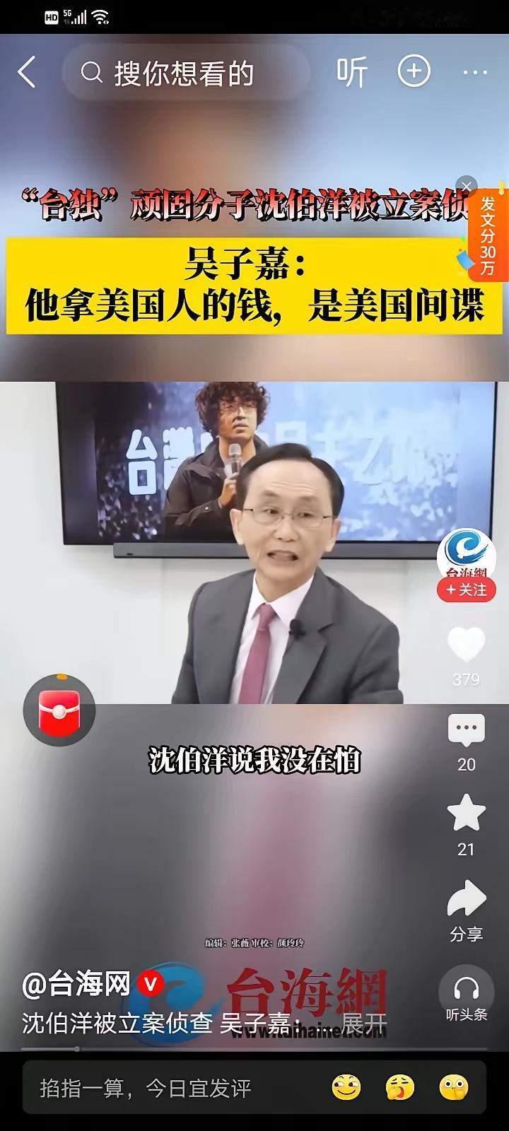 老吴立大功了,他实名举报台毒死硬分子沈伯洋是美国间谍,为重庆警方提供了重要线索。