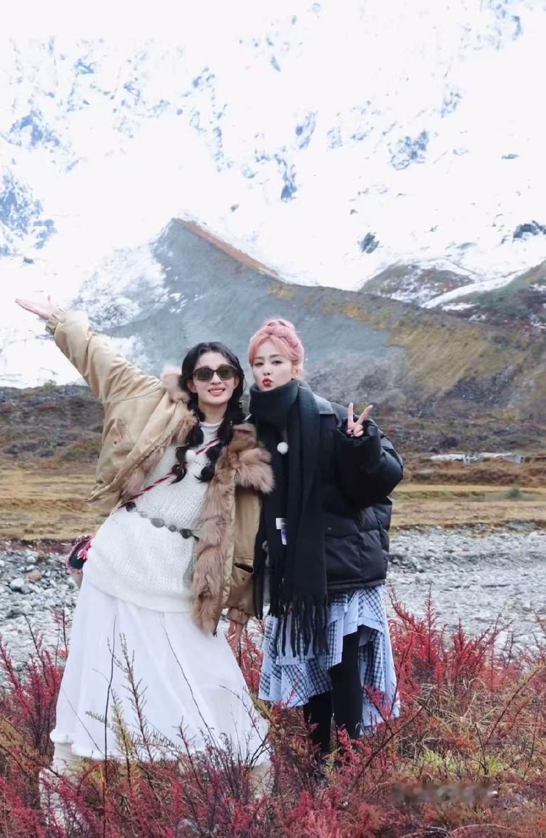 白鹿王楚然跑男雪山合影白鹿王楚然贴贴好赏心悦目的两个女宝