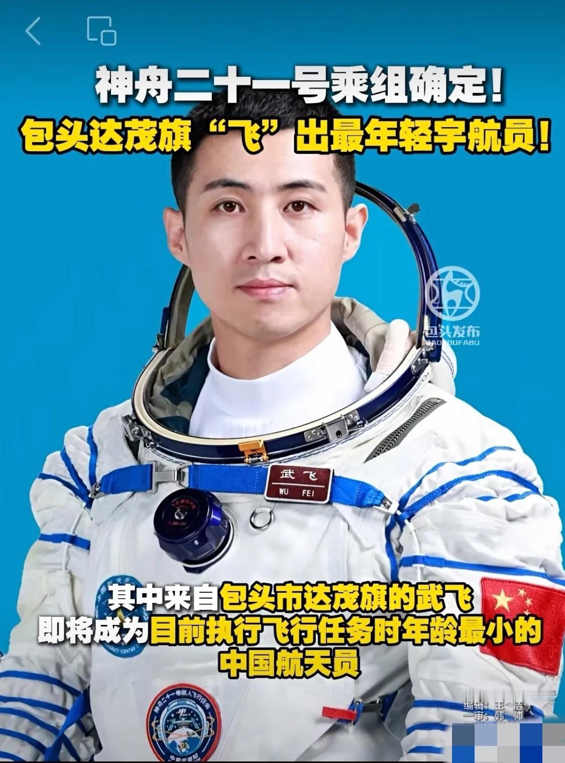 太燃了!“90后”草原小伙要上太空了,这才是年轻人该追的顶流! 武飞从内蒙古包头达茂旗的草原走出,作为我国第三批航天员,即将执行神舟二十一号任务,成了目前执行飞行任务最年轻的中国航天员。谁能想到,这位航天飞行工程师之前是航天科技集团空间技术研究院的工程师,这次要负责组合体照料、设备维护维修升级,还要验证新技术,实力真够硬。更有意思的是,他还是个军事迷,藏着这样的“反差身份”。 从草原到太空,武飞的经历告诉我们,不管来自哪里,只要有梦想肯努力,就能触摸星辰。他的首次太空之旅,不仅是个人的突破,更是草原儿女的骄傲,也让更多年轻人看到追梦的无限可能。 你们觉得武飞这次任务中,哪项工作最具挑战?来聊聊你的看法!
