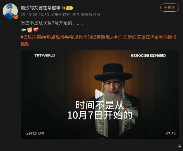 加沙的艾德,这个在西安的哈马斯,在中国的资助下吃喝玩乐的同时,继续煽动和传教,但是说话说得鬼鬼祟祟的,言中之意有两条: