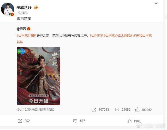 宋威龙转发宋茜来看楚瑜宋威龙转发支持宋茜山河枕 宋威龙带角色名转发!支持宋茜《山河枕》,“繁星相宋” 售后太惊喜,情怀拉满!