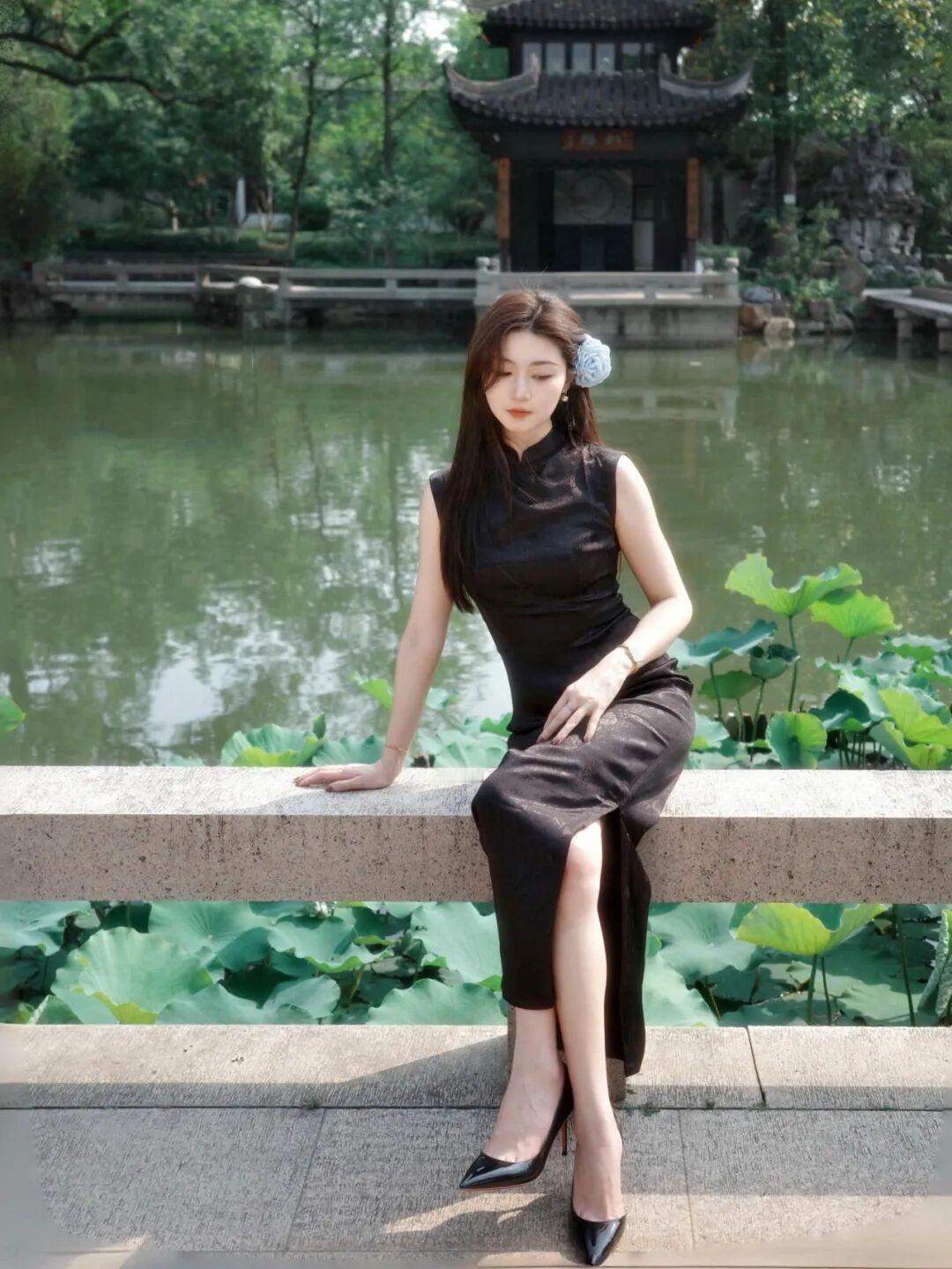复古钟表下的优雅时光,黑裙红唇的迷人风情。