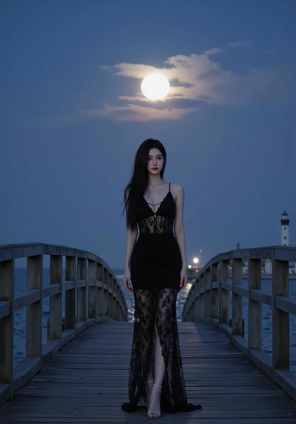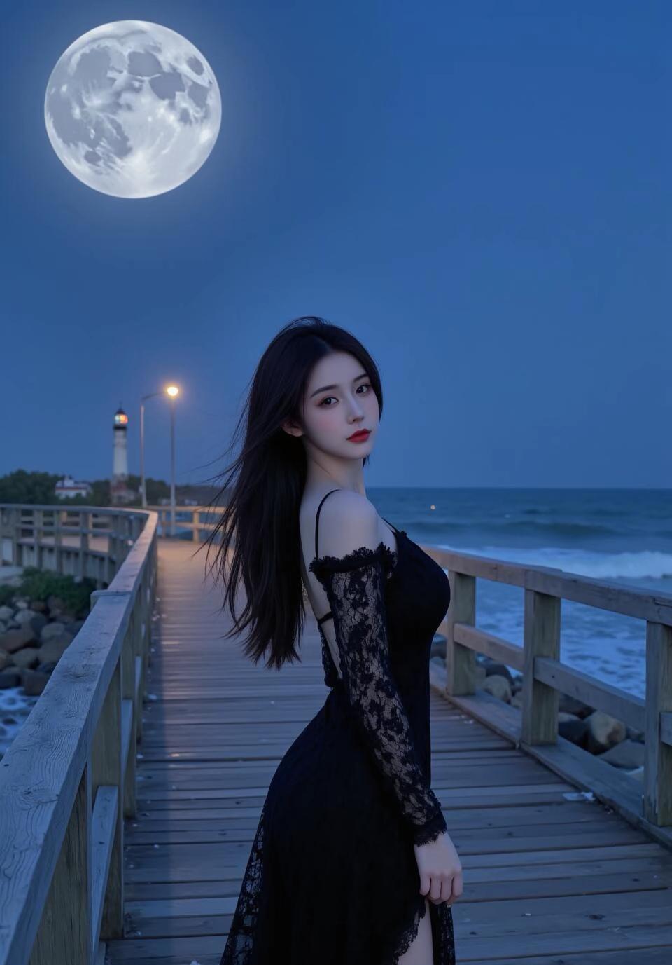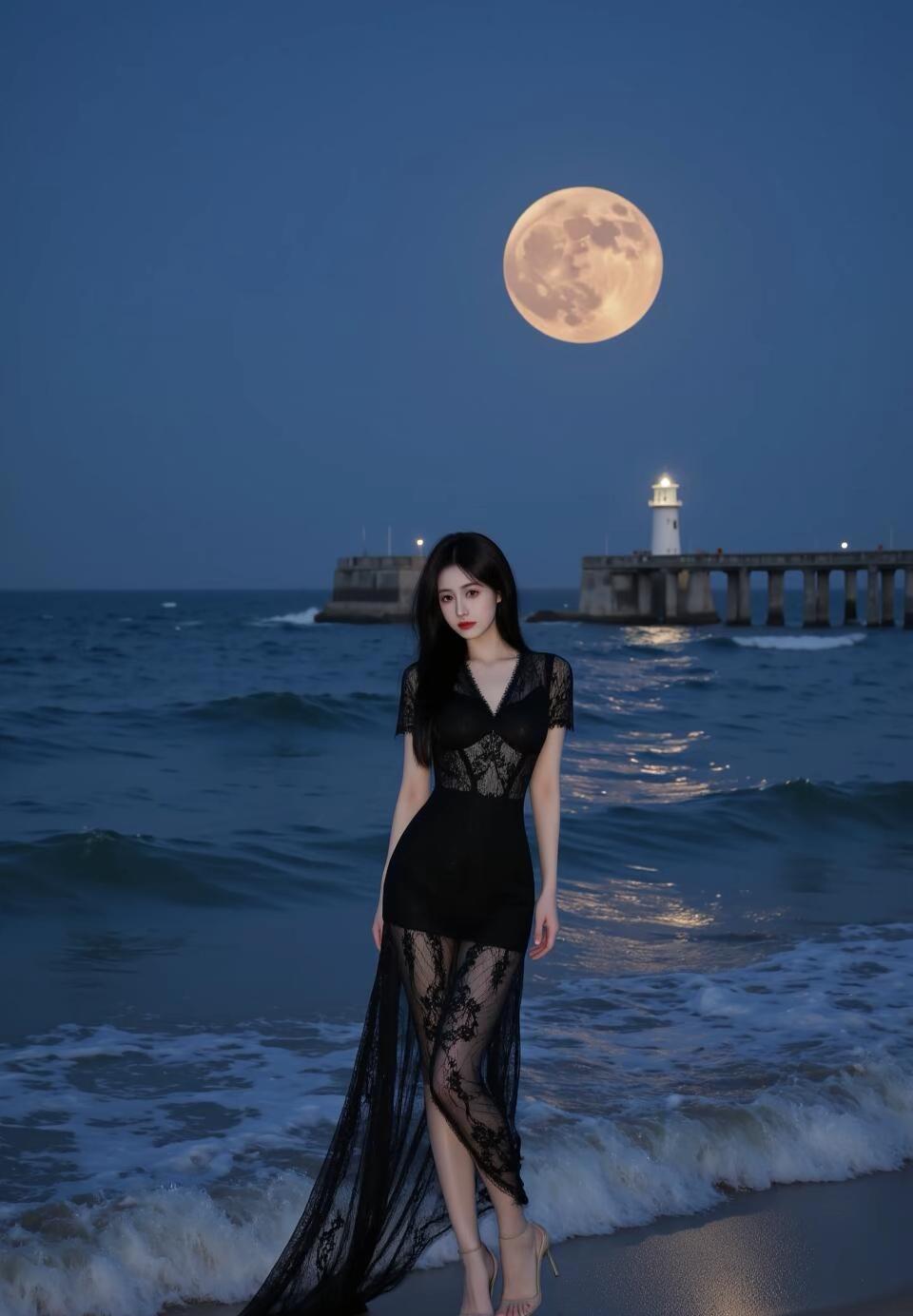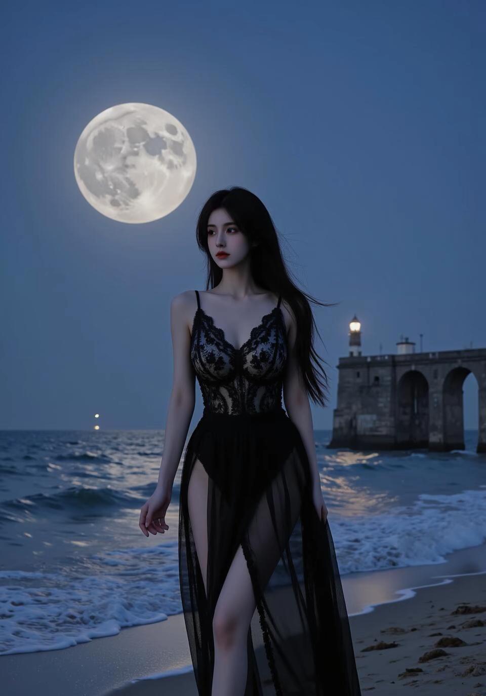 月光下的神秘女郎,海风轻拂,裙摆飘逸。