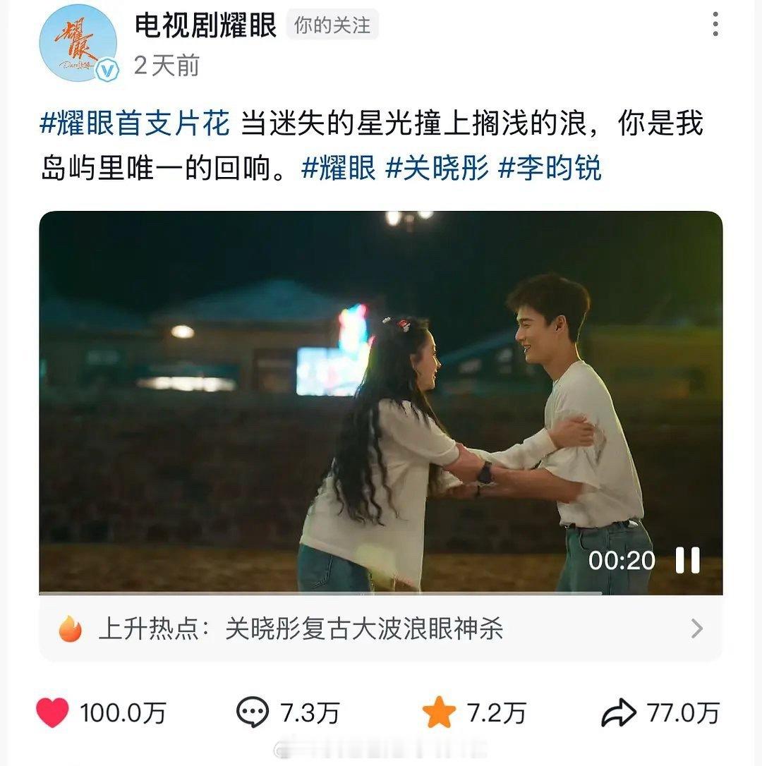 关晓彤、李昀锐的耀眼官抖首个百万赞🈶