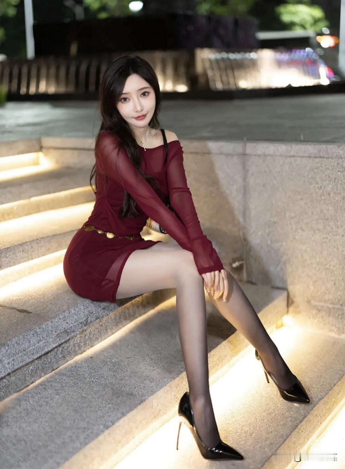 怎样穿搭知性又显身材? 这套穿搭的成功在于单品之间天衣无缝的配合: • 酒红色网纱衫负责营造知性、浪漫的氛围感。 • 黑色包臀裙负责精准刻画和展现优越的身体曲线。 • 高跟鞋与连裤袜联盟负责极致地优化和延长腿部线条。 • 金色腰链则作为桥梁,既提升了精致度,又强化了身材比例。 最终,在夜晚暖黄灯光的烘托下,整体造型成功地将“知性”的优雅内涵与“显身材”的视觉冲击力结合于一身,塑造出一位既迷人又充满智慧气质的现代都市女性穿搭形象。
