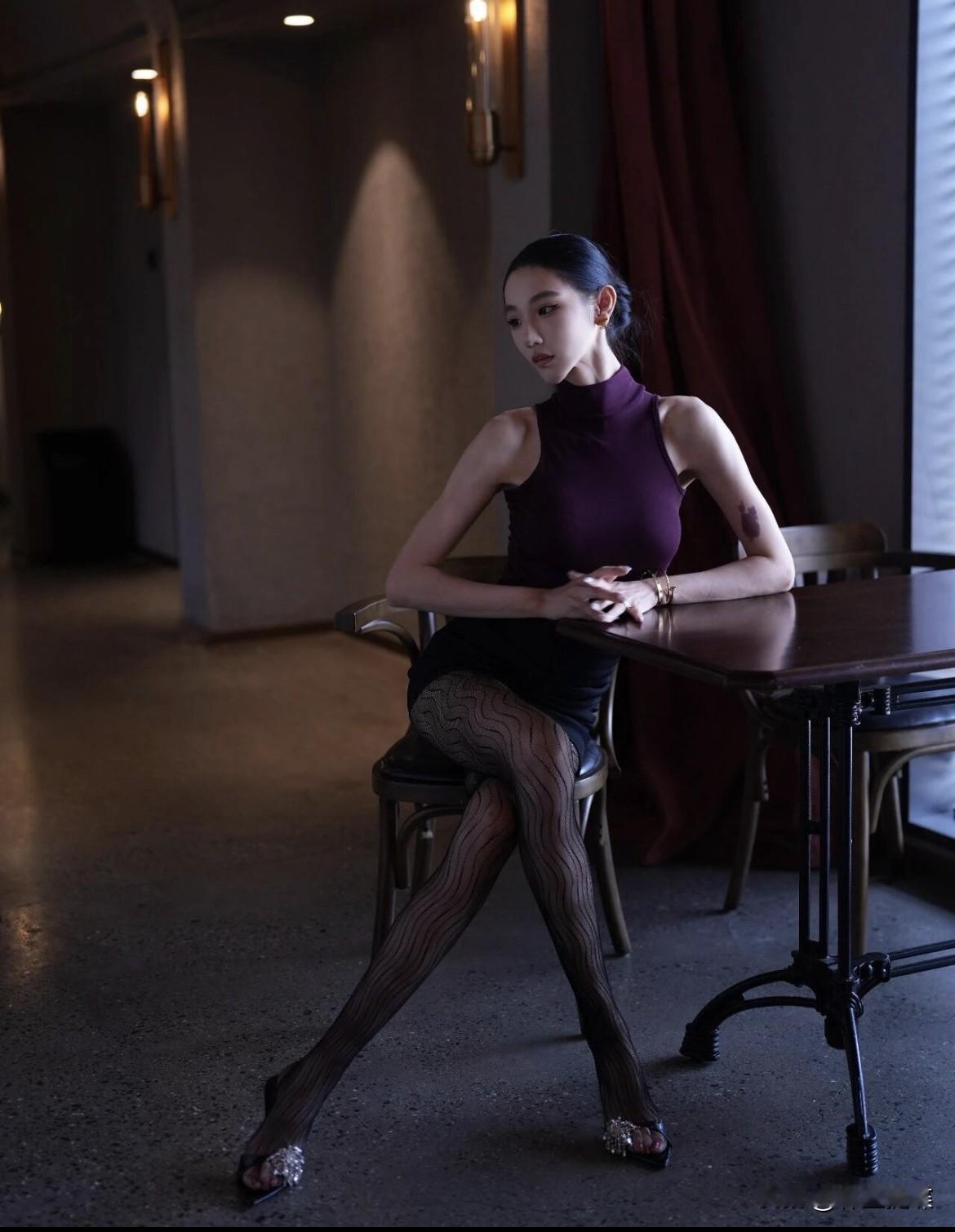 “紫色无袖上衣+短裤+波纹袜+小高跟”,紫色穿搭确实更有韵味 穿搭:深紫色高领