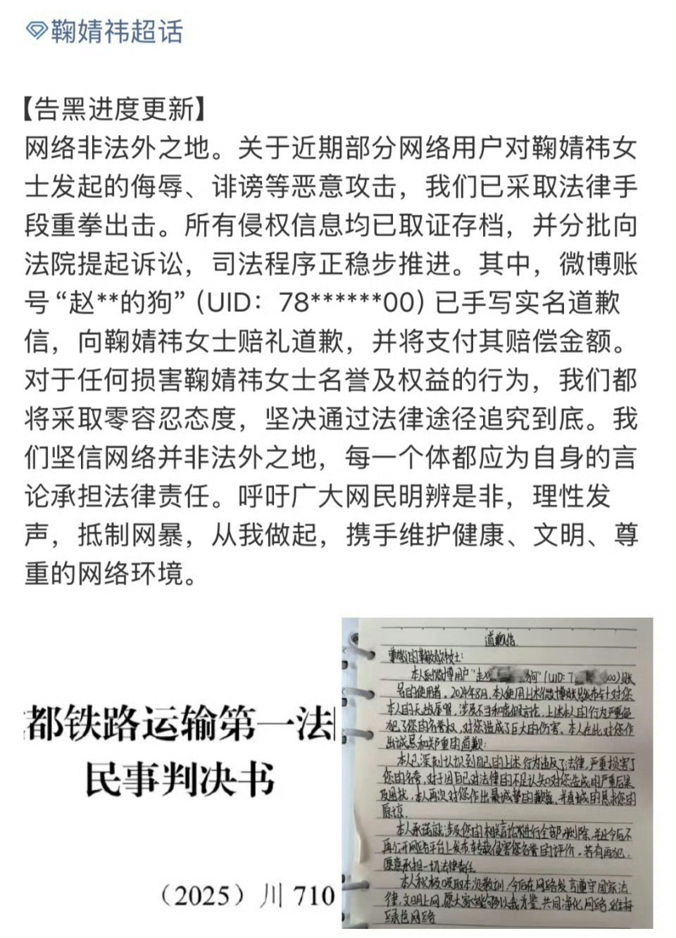鞠婧祎工作室发布告黑维权进度,黑粉手写道歉信,支持鞠婧祎维权!!