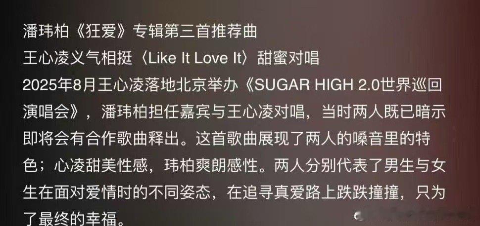 潘玮柏王心凌合作 两位歌手都有着扎实的唱功和独特的个人魅力,这次合作既保留各自特色又相互融合,相信会带来耳目一新的听觉体验。