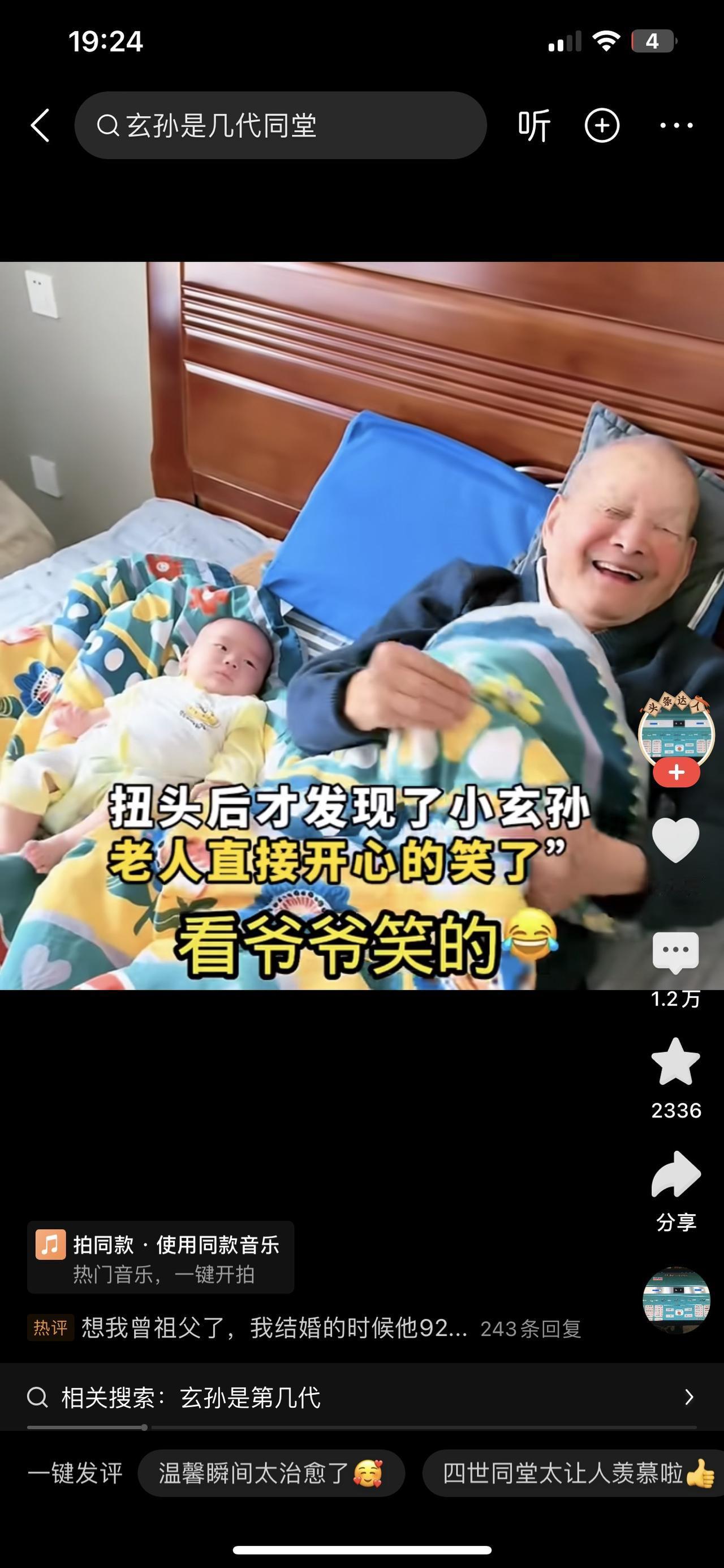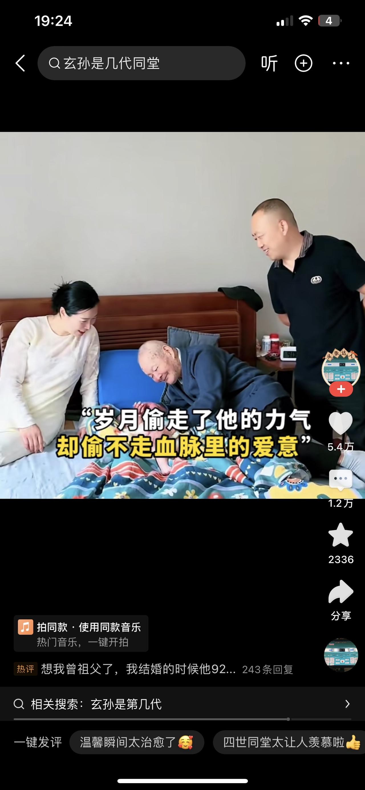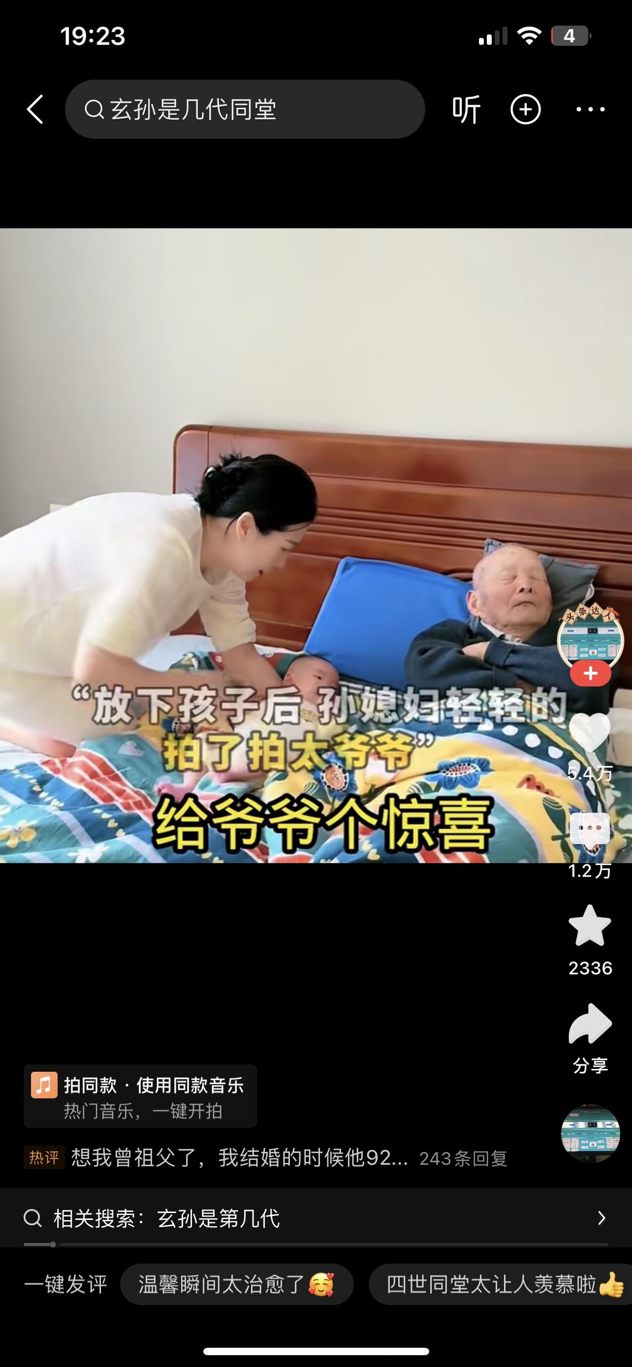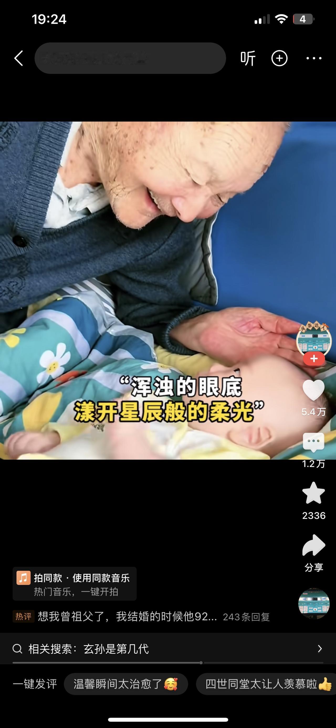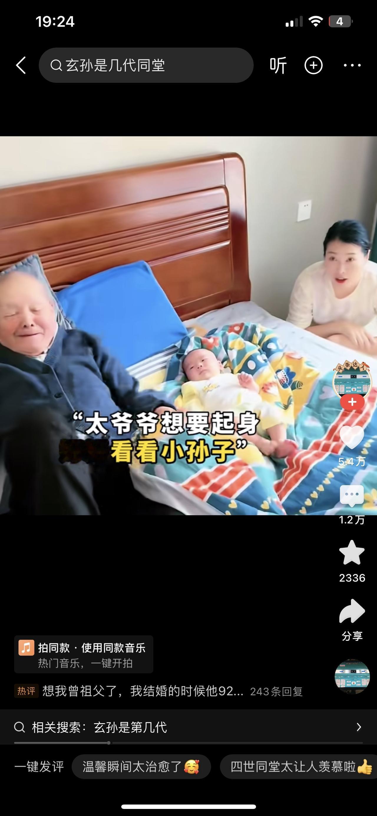 四世同堂的温馨瞬间,老爷爷和宝宝的心连心! 卧室里的阳光裹着暖,高龄老爷爷倚在床头,眼神往被子里探。旁边的儿媳笑着把裹成小团的玄孙往他手边放,他胳膊颤了颤,慢慢伸过去,指尖刚碰到宝宝的小拳头,就顿住了。 “是小玄孙?”老爷爷嗓子哑着问,身子往床边倾,想坐直了好好看。儿子赶紧伸手扶他,他却挥开,盯着宝宝皱皱的小脸,眼角的褶子一下堆成了花。 宝宝突然蹬了下腿,老爷爷笑得更开,枯瘦的手轻轻裹住宝宝的脚,小声说“这脚指头跟你太爷爷小时候一个样”。儿媳在旁边擦眼泪,说“爸您总算见着第五代了”。 老爷爷没接话,就盯着宝宝看,连呼吸都放轻了。宝宝似懂非懂地歪头,小手蹭到他的手背,他猛地攥紧,又怕弄疼了,赶紧松了松,嘴角的笑就没落下过。 儿子举着手机拍,镜头里老爷爷的眼睛亮得像藏了星。有邻居听见动静进来,看见这场景,叹着气说“这才是真福气,五代人攥着根呢”。 老爷爷听见了,抬头朝邻居摆手,另一只手还护着宝宝,声音轻却稳:“这根续上了,比啥都强。”窗外的风掀动窗帘,裹着满屋子的软和,把这一瞬钉成了日子里最暖的印。爷孙隔代 四代同堂住宅
