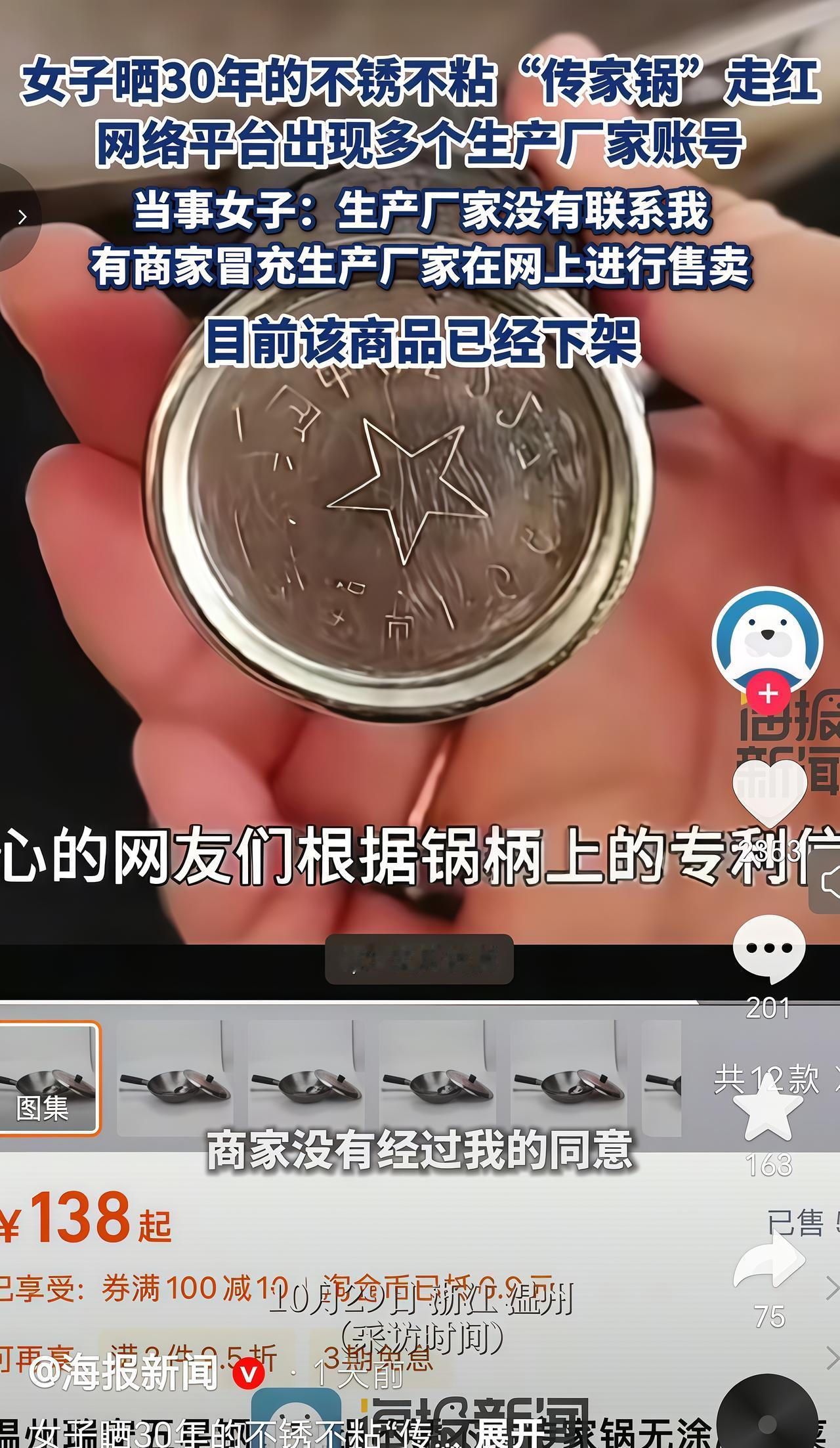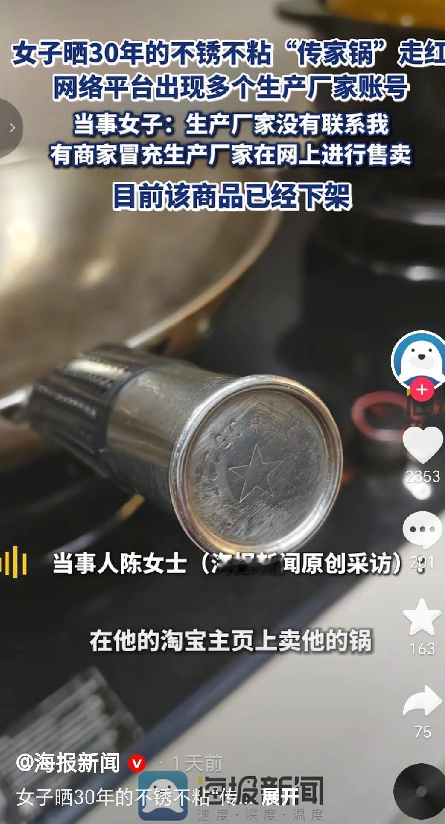 近日一网友晒出自己用了30年的不锈不粘“传家锅”后走红网络后,随之而来带来了一些烦恼,因为有不少网店未经当事人同意,擅自使用其“传家锅”的视频素材,用于自家商品的宣传销售,属于盗用他人内容进行商业推广。有网友根据锅柄上的专利信息找到了相关商家,但有消费者购买后发现产品与视频中的“传家锅”不符。当事女子称,商家未经她同意使用其原视频在淘宝主页卖锅,她担心这样会让别人认为她传播虚假信息,也怕消费者买回去发现不好用而浪费。(来源于@海报新闻)