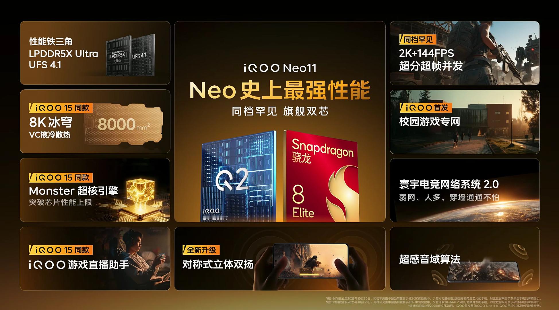iQOO Neo11 标准版都给了自研电竞芯片Q2,2K+144FPS超分超帧并发、2K纹理超分、144FPS超帧都是支持的。