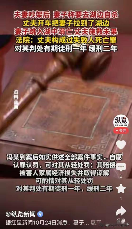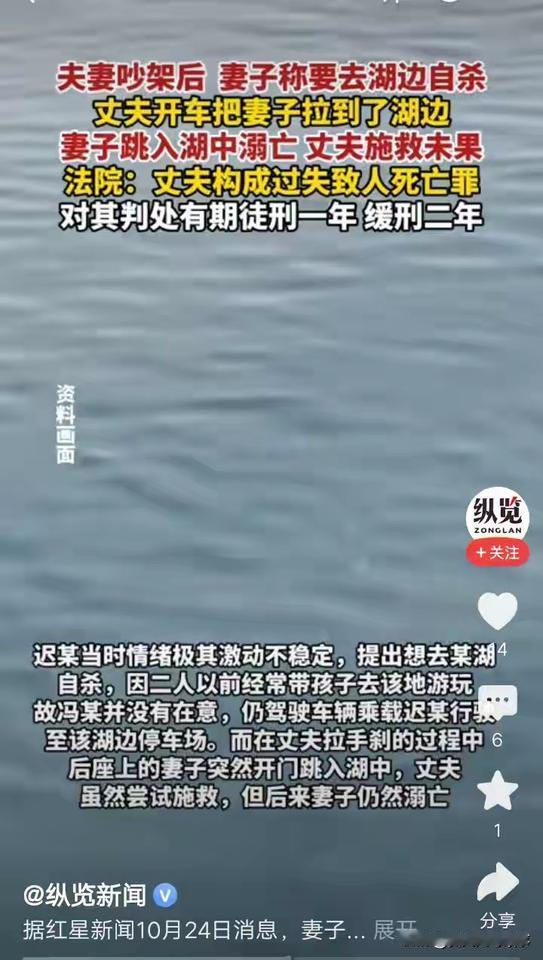 妻子称要跳湖自杀,丈夫却主动开车送她去湖边,妻子跳湖溺亡,背后隐情曝光 黑龙江宾县,冯某和妻子迟某,结婚两年多,两人育有两个孩子,夫妻感情不好,两人常常为了琐事,发生吵架。 不料,冯某和迟某,固执己见,谁也不愿向谁低头,都不愿主动化解矛盾。 两人为了生活琐事吵了两年,彼此心里的委屈,矛盾越来越深。 据红星新闻,10月24日消息,2023年9月的一天晚上,冯某和妻子迟某,再次为了生活琐事,发生了激烈争吵。 忽然迟某委屈已极,泪流满面,她奔出家门,向楼下飞奔。 冯某见状,急忙紧跟其后,在单元门口追上迟某,两人再次发生争吵。 过了一会儿,冯某和迟某先后进入一辆黑色轿车。 迟某情绪崩溃,产生了轻生念头,她一边哭泣,一边盯着冯某,幽幽地说:“我要跳湖自杀。” 不料,冯某不以为然,主动开车载着迟某去某湖,一路上,两人无语,迟某心情忧伤,低头啜泣。 转眼间,冯某开车把妻子迟某送到某边湖,迟某陡然打开车,她径直奔向湖边。 “扑嗵,”一声巨响,迟某跳进湖中。冯某施救未果,迟某溺亡,几天后,救援队把迟某遗体打捞上岸。 法院认为,冯某明知妻子迟某有轻生想法,却主动送迟某去湖边,导致迟某跳湖溺亡,他的行为,构成过失致人死亡罪。 冯某到案后,他如实供述全部案件事实,自愿认罪认罚,可以对他从轻处罚。 冯某主动赔偿,被害人近亲家属经济损取得她(他)们谅解,可对他从轻处罚 判处冯某有期徒刑一年,缓刑二年。 夫妻吵架,冯某没有主动去化解矛盾,却为了生活琐事,与妻子迟某吵架两年多。 迟某称要跳湖自杀,冯某却主动送迟某去湖边,导致迟某跳湖溺亡,冯某的异常行为,惹人争议。 夫妻吵架,不应该长时间争吵,应该主动化解矛盾,才能家和万事兴。 来源纵览新闻