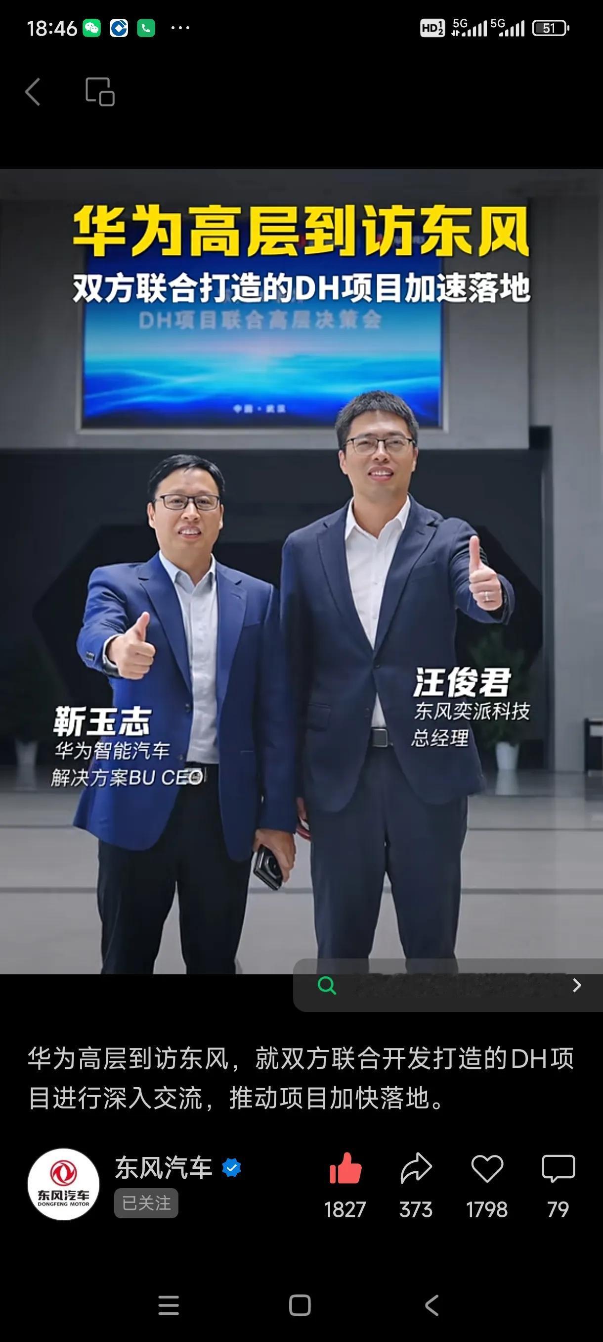近日东风汽车官方发布信息,东风携手华为打造的DH系列中高端智能化车型,面向社会各