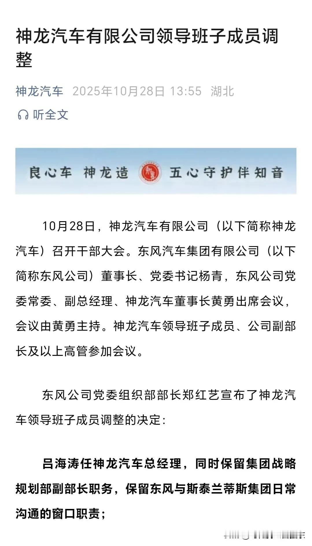 近日东风汽车官方发布信息,东风携手华为打造的DH系列中高端智能化车型,面向社会各界征集新品牌命名&LOGO设计。这是东风汽车“十四五”时期在自主新能源品牌布局上的最后一个大手笔。 纵观整个“十四五”,东风先后打造了高端智慧新能源品牌东风岚图、豪华电动越野品牌东风猛士、主流市场东风纳米和东风eπ等新能源品牌,全面形成覆盖豪华、高端、主流各细分市场的自主新能源品牌格局。 网友建议岚图出--楚河,奕派DH出--漢境,猛士XY出---匠襄? [太阳][太阳] 10月27日,东风汽车集团有限公司召开领导班子(扩大)会议,王俊出任东风汽车集团有限公司副总经理、党委常委。这位拥有丰富汽车行业经验的“70后”高管,成为东风领导团队的新成员。 短短三天内,东风体系内多项人事调整与组织变革密集推进——10月28日,神龙汽车换帅,吕海涛回归担任总经理;10月29日,东风研发总院领导班子调整,唐竞不再担任原职。 [太阳][太阳] 10月30日,长安朱华荣在武汉东风会见杨青总和新上任的冯长军,表示对东风在自主品牌向上突破、新能源战略布局及合资合作模式创新等方面取得的成果给予高度评价。他表示,面对汽车产业的深刻变革,中国汽车企业加强协同尤为重要。
