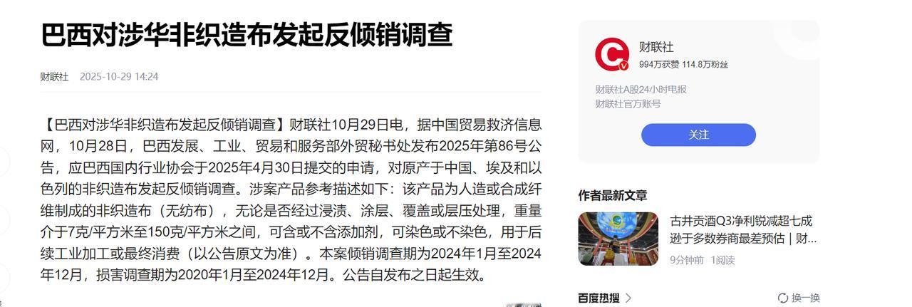 果不其然! 巴西突然正式宣布了! 巴西昨天正式对我无纺布启动反倾销调查,调查对象还包括埃及和以色列。 巴西这两年在贸易上的操作早就露出苗头,一边跟咱们签千亿级的本币互换协议,一边反手就抡起反倾销大棒,这次对无纺布下手,不过是故技重施罢了。 10 月 28 号,巴西外贸秘书处正式发了公告,要对咱们中国还有埃及、以色列的无纺布发起反倾销调查,说是应了他们本土行业协会的申请。 大家可别以为这只是小打小闹,这次调查的范围宽得很,凡是人造或合成纤维做的无纺布,不管有没有涂层、染没染色,只要重量在 7 克到 150 克每平方米之间,全被划进去了,小到口罩、尿不湿用的料子,大到汽车内饰、装修防潮布的材料,几乎把日常和工业用的主要品类都包圆了。 调查期也不短,要查 2024 年一整年的出口情况,还得倒追五年,看 2020 年到 2024 年所谓的 “损害” 情况,明摆着是想找 “茬”。 要说巴西为啥盯着无纺布不放,数据最能说明问题。咱们国家是全球最大的无纺布生产国,2024 年出口量就有 142.8 万吨,占了全世界一半还多的份额,足足 51.2%。 巴西自己就是咱们第三大出口市场,占了 8.5% 的份额,他们本土市场上好多刚需产品都离不开咱们的货。 但这可不是咱们靠低价抢来的,就说国内的金春股份,光水刺无纺布生产线就有 11 条,年产能超 6 万吨,还专门设了博士后工作站搞研发;北京大源的热风无纺布年产能都到 6 万多吨了,这些都是靠技术和规模效应攒下的竞争力,哪是什么 “倾销”。 更让人觉得 “早有预谋” 的是,这根本不是巴西第一次对咱们下手。去年 12 月刚查了聚酯纤维织物和纱线,今年 4 月又对彩涂板做了反倾销初裁,9 月才给聚酯短纤开了罚单,10 月底就紧接着盯上无纺布,这频率简直是把反倾销当常规操作了。 他们嘴上喊着 “公平贸易”,实则就是本土产业扛不住竞争,找政府帮忙设门槛。就像之前对钛白粉征税,咱们的产品占了巴西 80% 的市场,他们本土企业没优势,就直接把临时税翻倍,每吨征 1100 多美元的反倾销税,说白了就是保护落后产能。 可这招根本是饮鸩止渴,最后吃亏的还是巴西自己。无纺布这东西用途太广了,口罩、尿不湿这些民生用品缺了它不行,汽车、装修等行业也离不了。 要是真给咱们加征高额关税,估计得涨到每千克 0.69 到 4.81 美元,巴西下游企业的成本肯定暴涨,最后还得把价格转嫁到消费者身上,老百姓买东西得花更多钱。 而且他们对咱们的依赖度摆在这,去年咱们进口巴西的大豆、铁矿那么多,双方本来是互补的生意,这么搞反而伤了和气。 不过咱们的企业也不是没见过世面,应对这种事早有经验。当年福耀玻璃在美国被反倾销,人家曹晖带着团队收集数据、跟美方打官司,最后硬是让美国商务部撤回了裁决,成了首个告赢美国商务部的中国企业。 还有国林科技,之前在欧盟的反倾销案里,把初裁的 175.8% 税率硬生生降到 57.3%,靠的就是积极应诉、用数据说话。 现在巴西给了 30 天时间提交问卷,虽然要通过他们的 SEI 系统,还得用葡萄牙语准备材料,挺麻烦,但只要企业赶紧行动,把生产记录、成本核算这些证据准备齐了,不是没机会赢。 再说了,巴西这操作本身就矛盾得很。一边跟咱们续签 1900 亿元的本币互换协议,把人民币当成第二大储备货币,说要深化金融合作;一边又在贸易上处处设限,这种 “又要合作又要打压” 的套路,说白了就是想两头占便宜。 但咱们也早有准备,像钛白粉出口,巴西只占 7.7%,东南亚、非洲市场早就布局好了,就算这边受点影响,整体也稳得住。 所以说,巴西这次对无纺布搞反倾销,真的是 “果不其然” 的贸易保护招数。咱们不用慌,企业积极应诉,拿出真凭实据证明自己没倾销,行业协会抱团取暖,再加上政府层面按世贸规则交涉,总能守住阵地。 倒是巴西该好好想想,老是靠关税壁垒护着本土企业,永远练不出真本事,反而会错失优质产品和合作机会,这么做实在不划算。