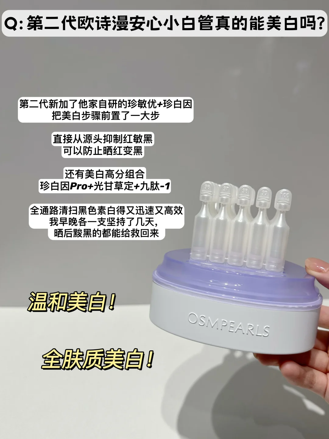 最近看618第二代欧诗漫安心小白管大促不到3块钱一支!性价比很高!好多人都蠢蠢欲动了 真的有这么好用?必须买来一探究竟! 一用还真是惊艳到我了! 回答一下大家的一些问题: 1.第二代欧诗漫安心小白管真的能美白吗? 对于这个问题,我之前也是半信半疑,因为它主打温和美白,就担心没效果用了个寂寞 我前段时间去海边顶着大太阳晒了几天,回来就黑了两个度 不敢用有刺激性的,抹了好多东西都没用🥲 直到我试了小白管,真的后悔没早买! 第二代新加了他家自研的珍敏优+珍白因 把美白步骤前置了一大步 直接从源头抑制红敏黑,可以防止晒红变黑 要是我早一点用上,估计也不会黑两个度了! 还有美白高分组合珍白因Pro+光甘草定+九肽-1 全通路清扫黑色素,白得又迅速又高效 我早晚各一支坚持了几天, 晒后黢黑的都能给救回来 日常美白你就就坚持用吧!包白的! 2.敏感肌可以用吗? 当然可以!还是敏肌定制的美白精华 人家主打一个美白修护二合一 还有B5+奥婷敏+乙酰壳糖胺 这些大厂修护精华的配置内外精准修护 修护受损屏障 强韧肌底 补水保湿、舒缓泛红、厚修屏障多手抓! 这一套下来敏感肌都能给你养好了!🥰 3.用了会不会反黑? 就我自己来看,做好日常防晒是没问题的 而且屏障被它给养好养厚实了 也更不容易晒黑反黑 4.小白管的使用方法是什么? 我日常是早晚各一支 均匀涂抹在面部 白天可以搭配防晒一起用 先涂小白管,再叠加使用小白管防晒, 后续化妆也不会卡粉搓泥,底妆都更服帖了 晚上可以搭配面霜一起使用 像晒后急救可以多加半支涂在泛红区域 连续用下来你会发现皮肤真的变白变好了! 欧诗漫在专业研究美白58年了,美白都是看家本领 第二代小白管不管是美白还是修护效果都更上一层楼! 想要能肉眼可见美白效果的,真的别错过!! 欧诗漫欧诗漫安心小白管小白管次拋精华美白美白必备护肤第二代欧诗漫安心小白管美白精华敏感肌美白精华晒后美白聚光不惧光
