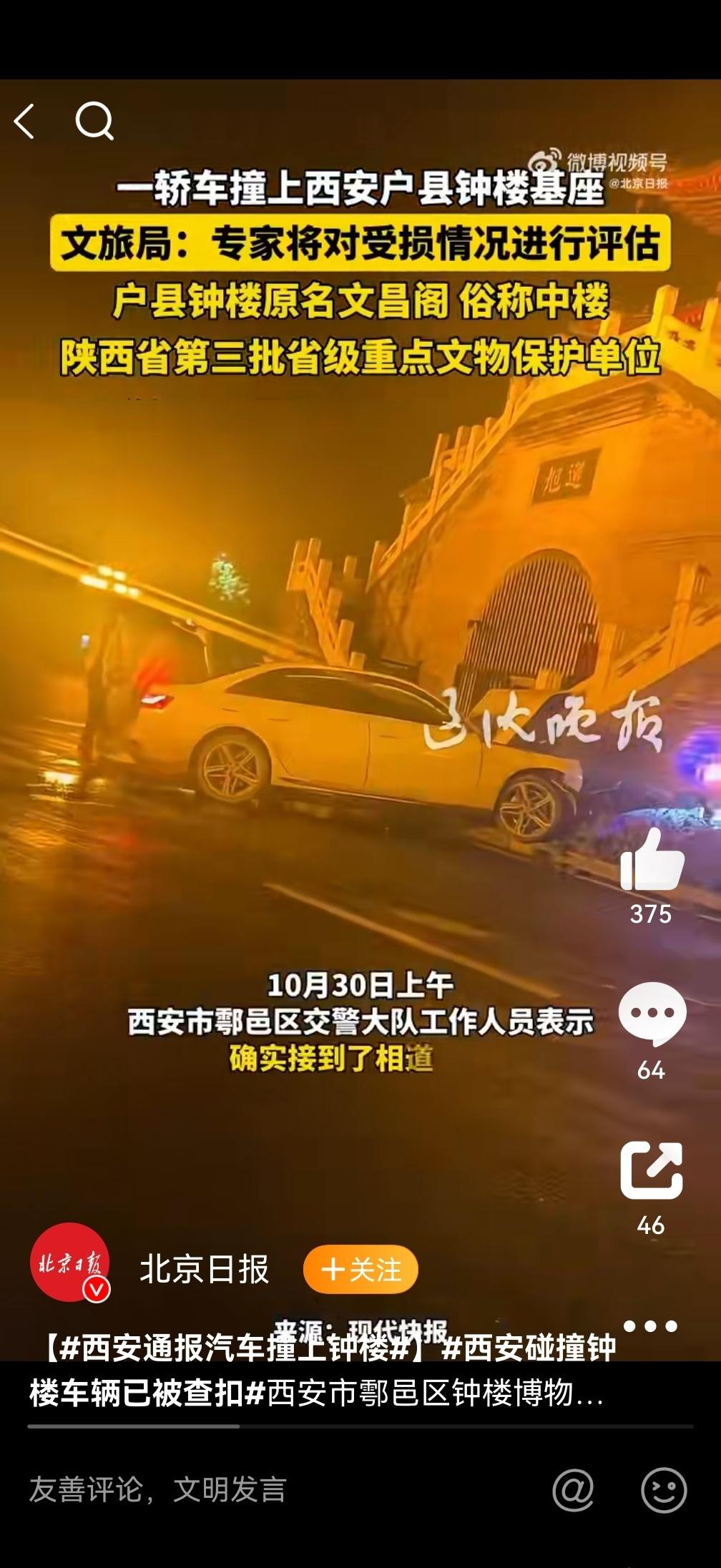 西安通报汽车撞上钟楼,第一眼看到这个话题,我以为是搞笑的或者是谐音梗的事情,没想到竟然是真的新闻,这也太离谱了。