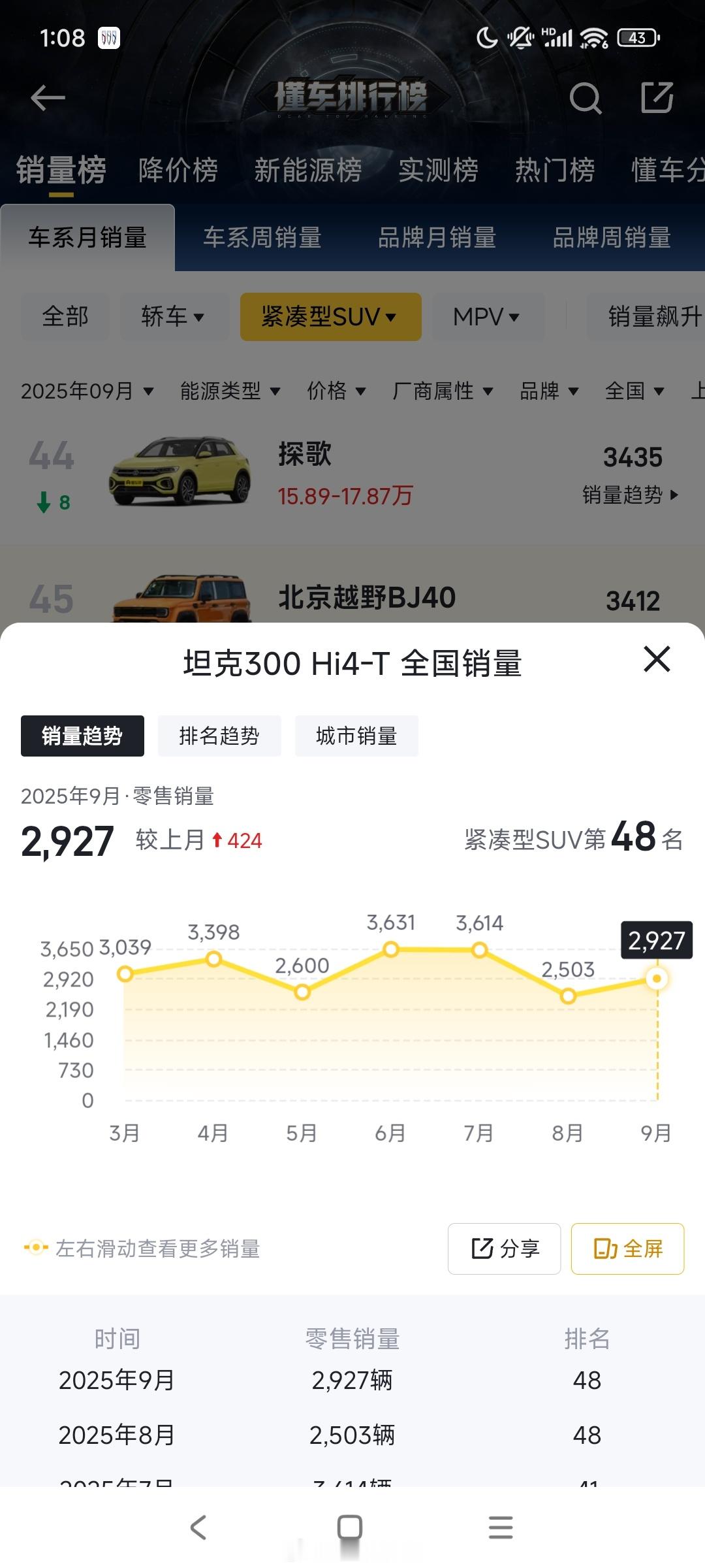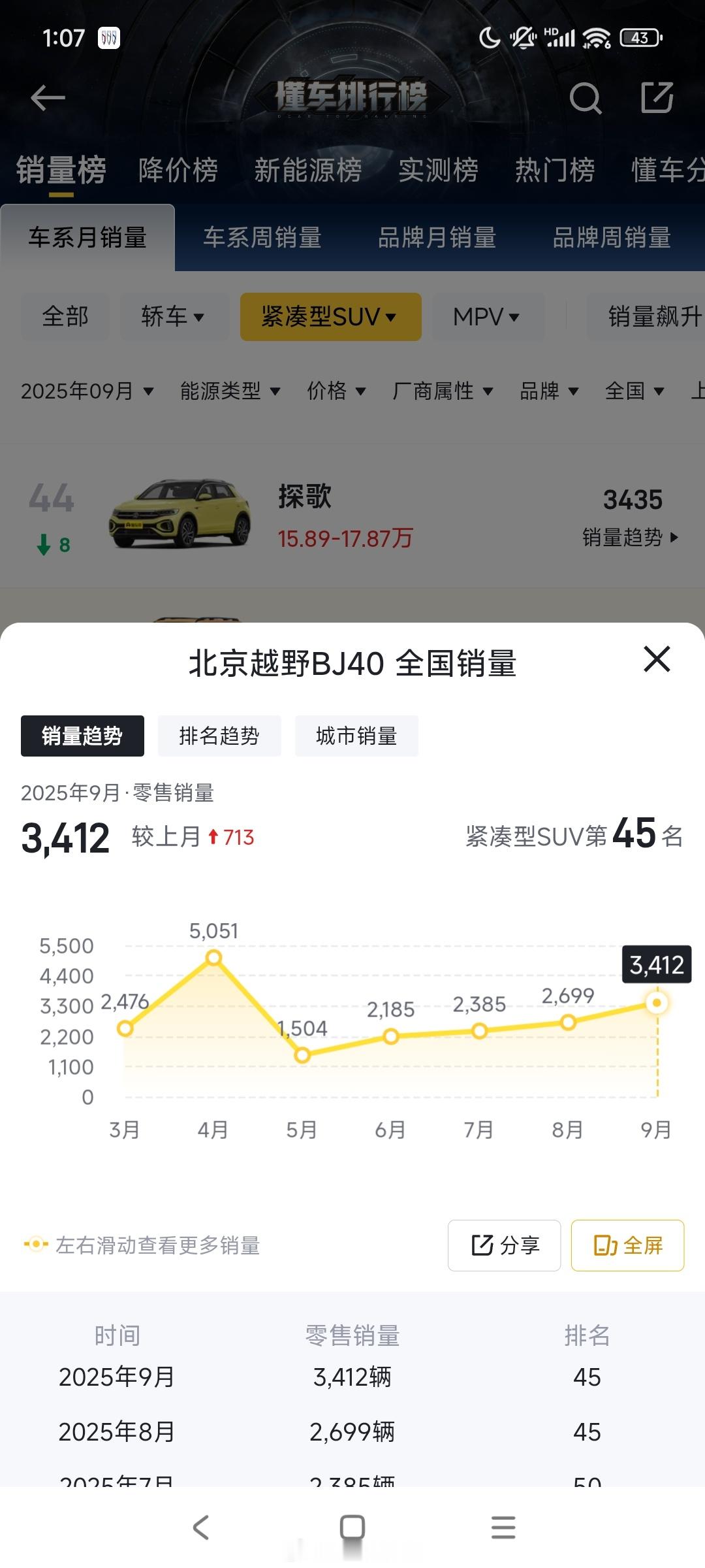 最近发现路上BJ40真多,特别绿牌(增程版),五颜六色的,真的肉眼可见的多。查了下销量数据,9月份这车在国内的销量(燃油+新能源)已经超过了坦克300家族,销量接近9千台。而我们这个五线北方城市竟然能有50台的上牌量。所以长城所说的“打死不做增程”,或许真正的表达对象是北汽吧。bj40bj40增程