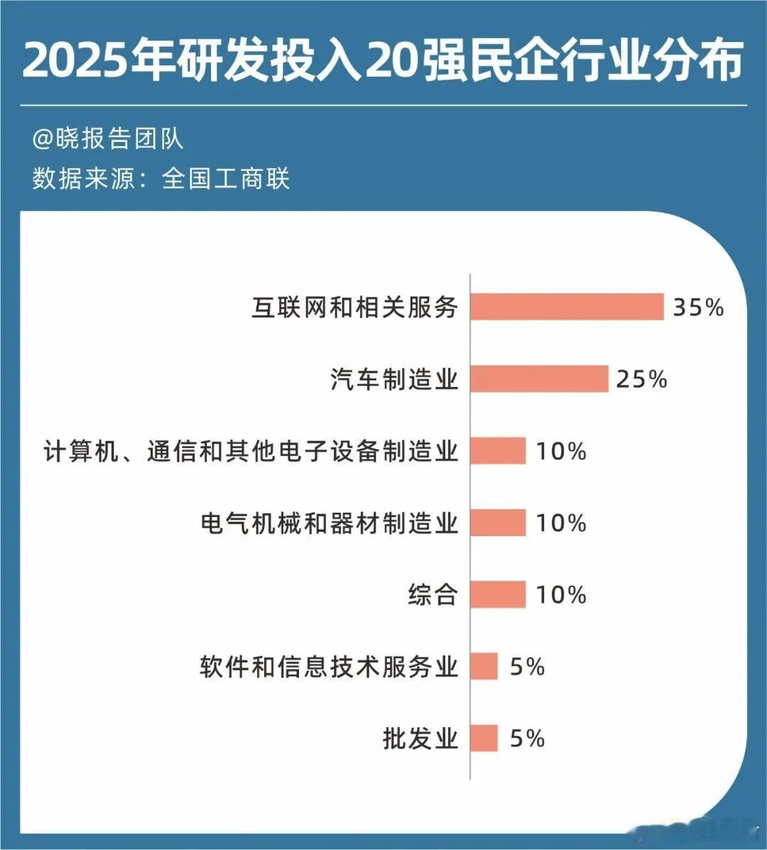 进一步来看,在工商联发布的2025年“民营企业研发投入500强榜单”中,来自计算机通信、互联网和汽车制造领域的民企构成了创新主力军,它们包揽了研发投入前20强中的14席。