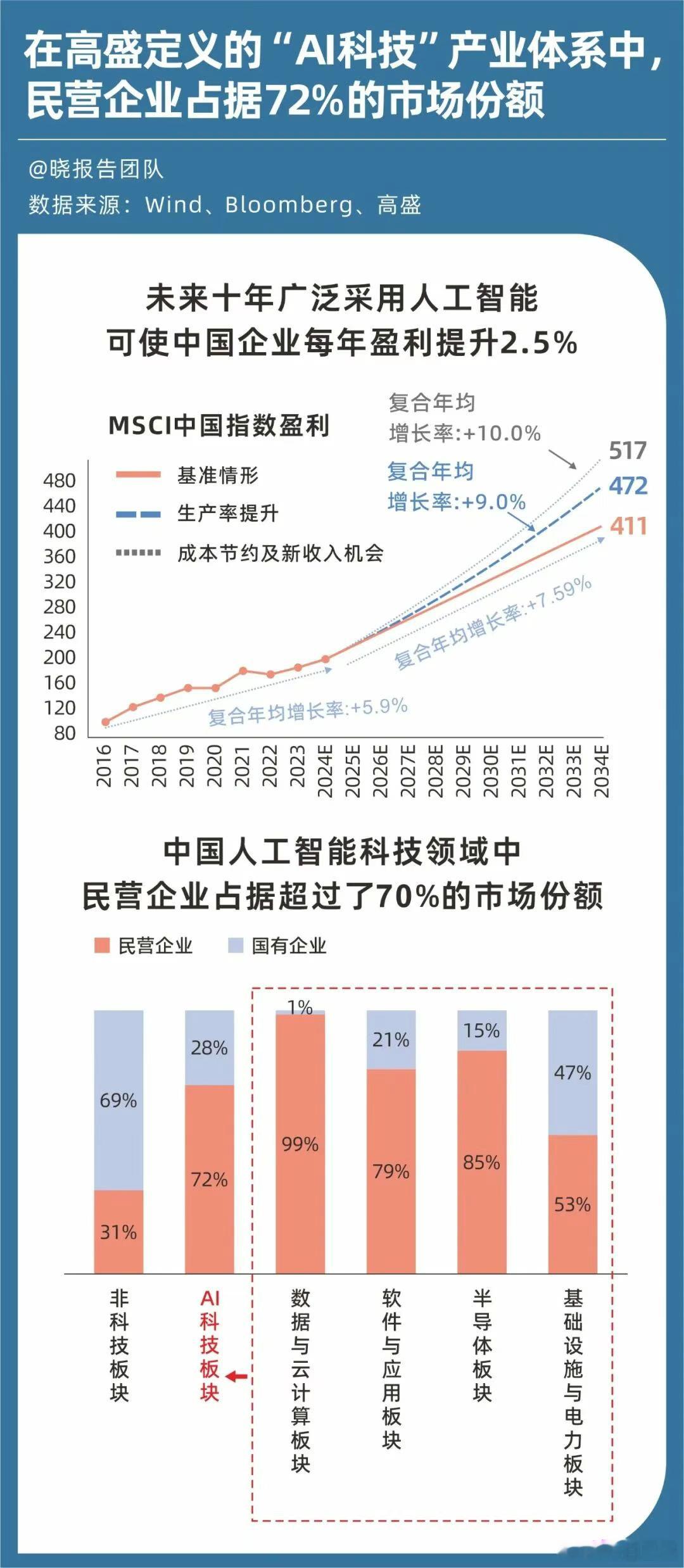 在高盛定义的“AI科技”产业体系中,民营企业占据72%的市场份额,范围涵盖半导体、电力与基础设施、数据与云计算、软件与应用等多个关键领域。