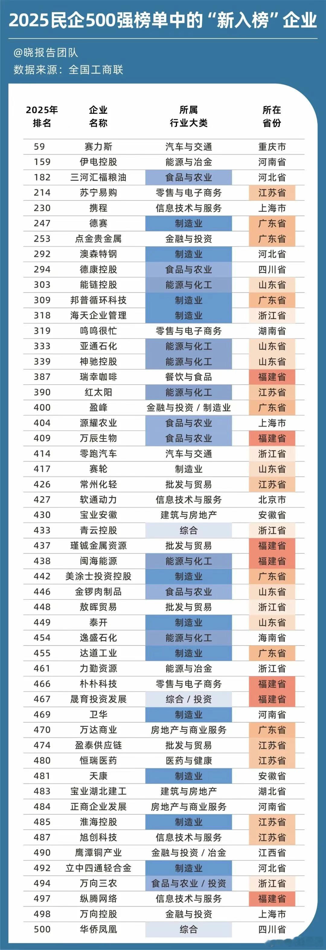 在这52家新上榜的民企中,近半数来自制造业、能源化工与食品领域。地域分布上,福建、广东、江苏、山东和浙江则贡献了主要力量,超65%的民企来自这些省份。