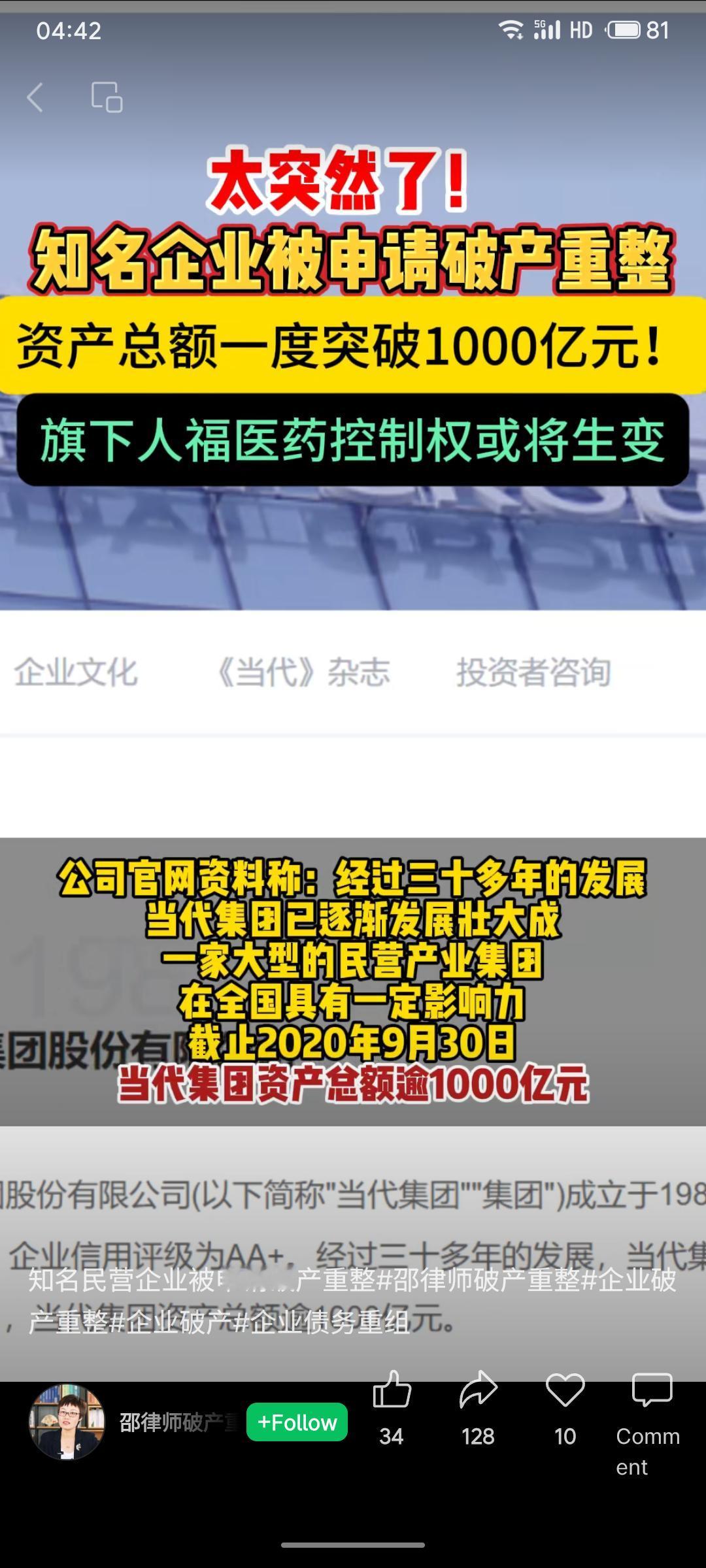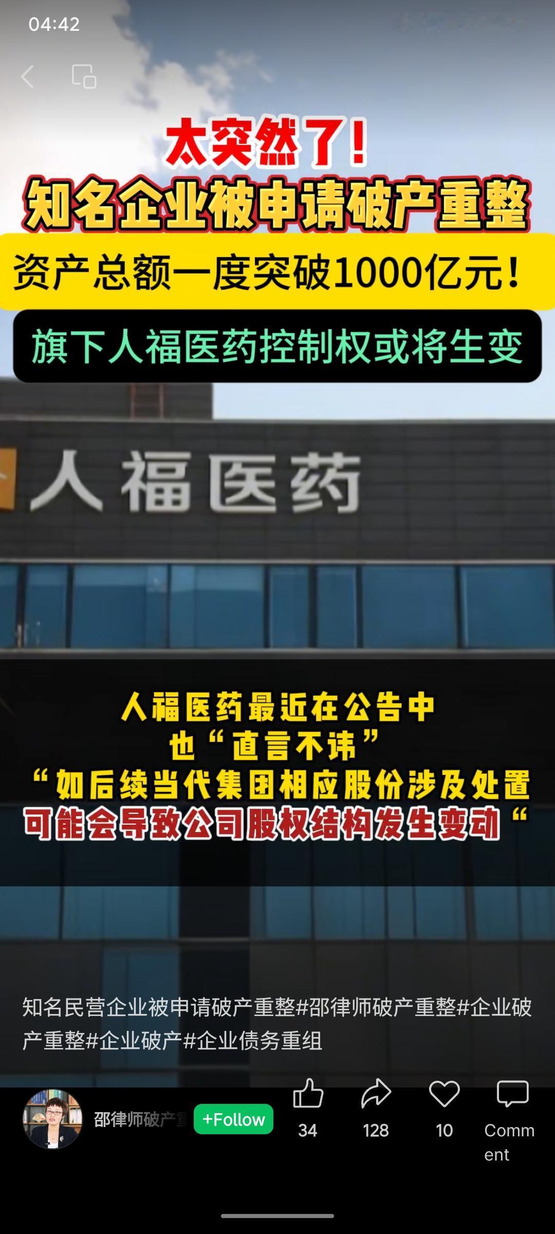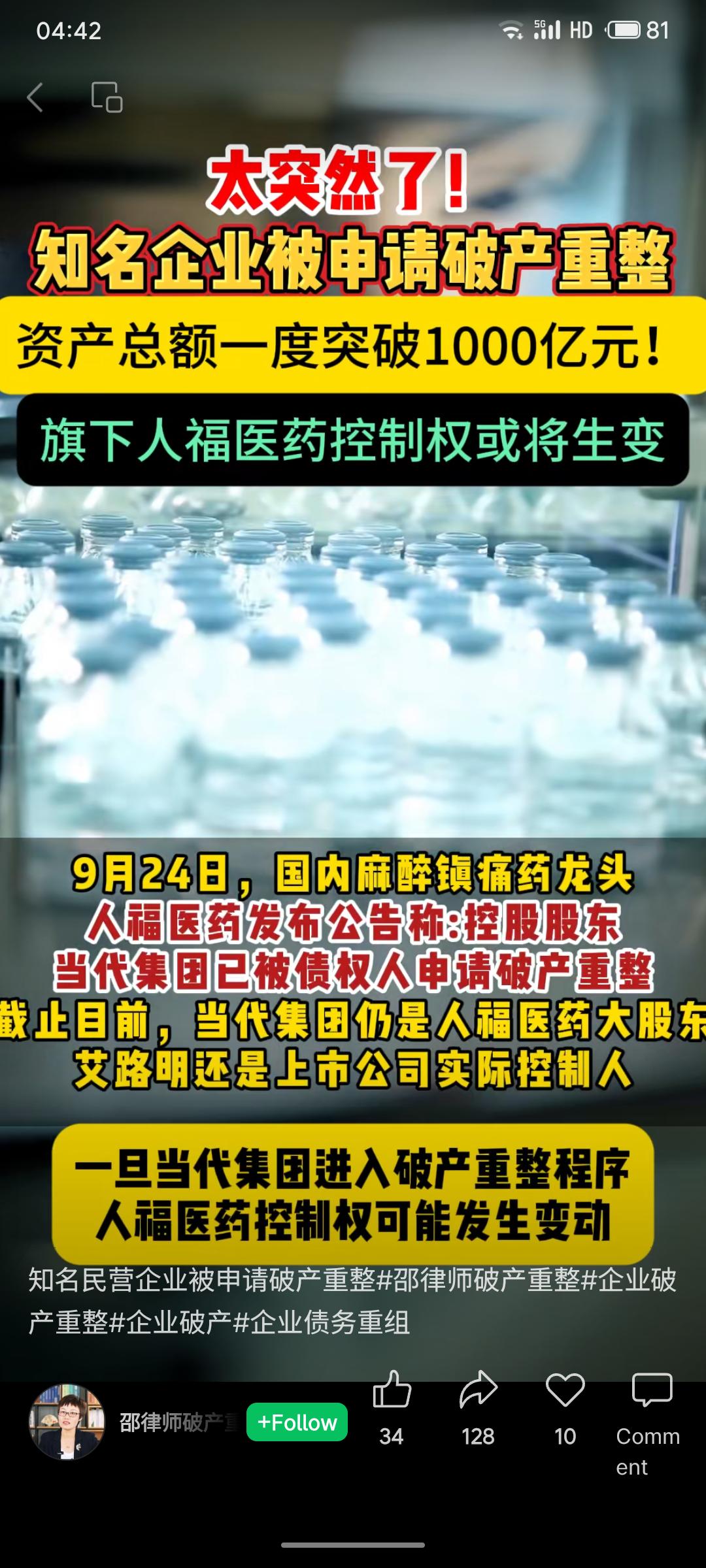 知名民营集团当代科技被债权人申请破产重整,该集团资产总额曾超千亿元。其控股的上市公司人福医药发布公告称,若破产重整程序推进,公司控制权可能发生变更。