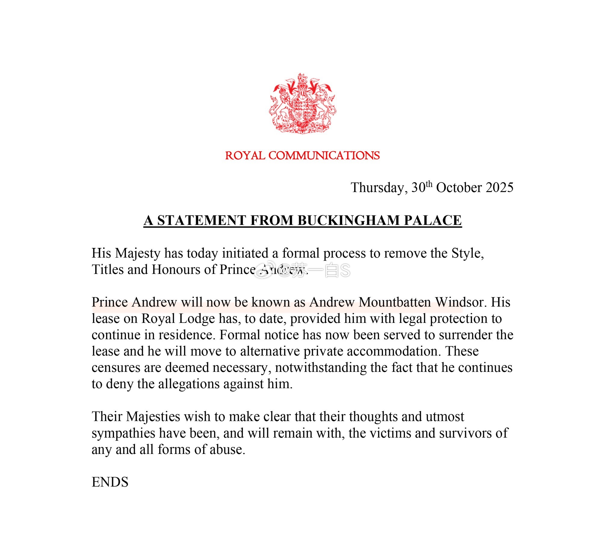 白金汉宫刚宣布,安德鲁将被剥夺所有剩余头衔,以后只能叫Andrew Mountbatten Windsor,他现在租住的皇家别墅也已被终止租约。