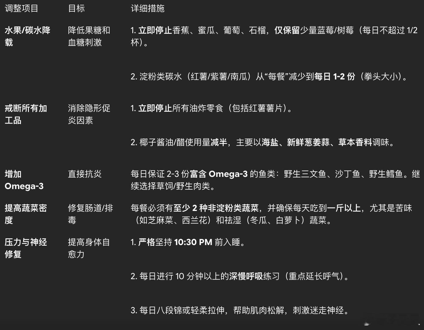 3. 睡眠,10:30躺下,手机放卧室外。提前一小时关闭所有屏幕、避免蓝光,可以读纸质书、温水泡脚、听舒缓音乐。睡眠是身体修复和调节免疫的黄金时间,重要性不亚于饮食,睡一个好觉比吃一顿完美抗炎餐更重要,努力捍卫睡眠时间