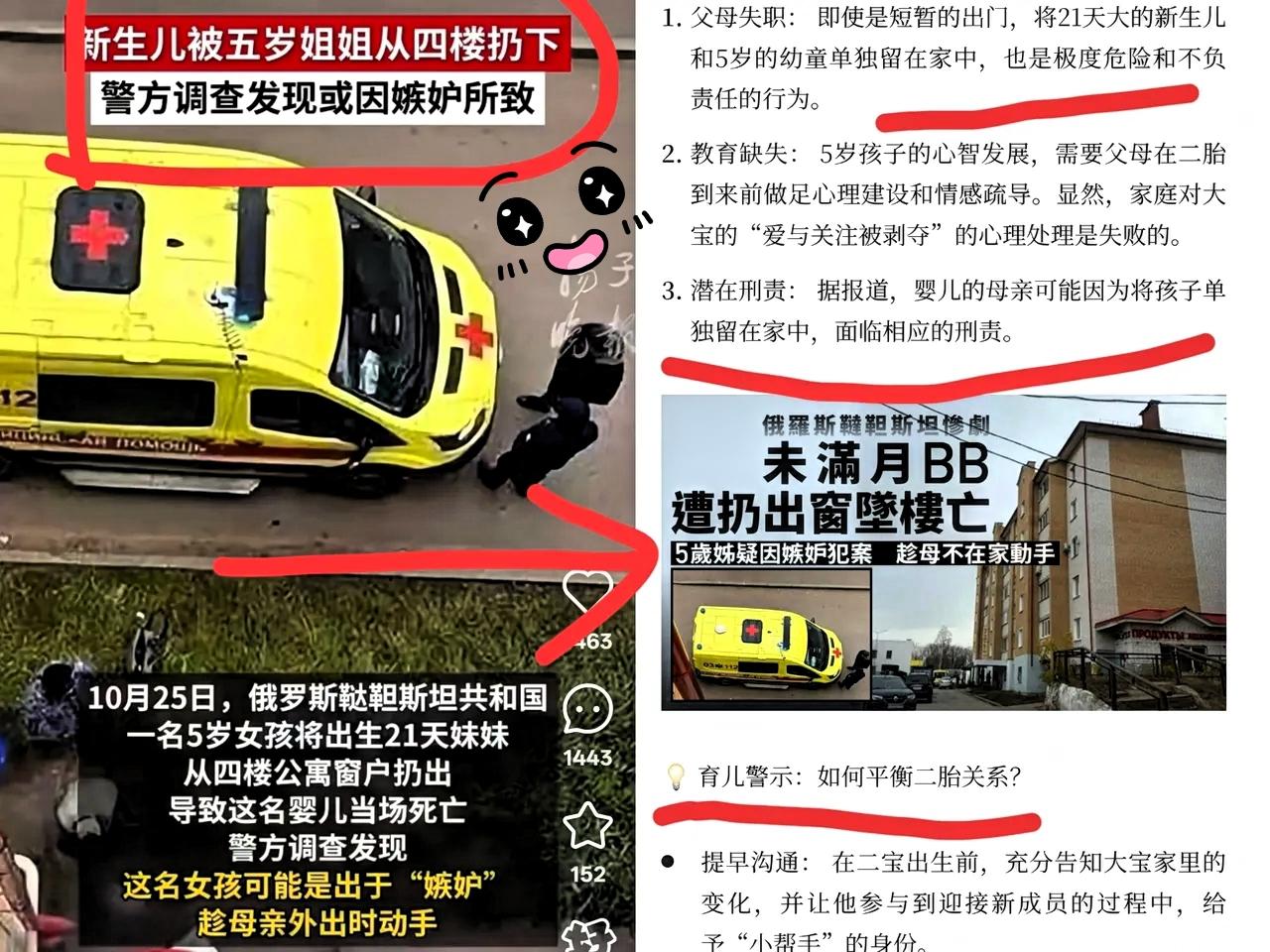 5岁姐姐把21天妹妹从4楼扔下,真不是天生坏种! 她那点小心思其实特扎心——“妹妹没了,妈妈就只爱我了”。 这哪是恶毒,分明是孩子的世界太简单,简单到只能用“删除”竞争者的方式,抢回曾经独属于自己的爱。 她根本不懂死亡是什么,只知道妈妈的怀抱、睡前的故事,全都被这个“小不点儿”分走了。 好多家长总说“你是姐姐要懂事”,可没人教孩子怎么接受“爱被分享”。老大尿床、发脾气、故意捣乱,都是在喊“看看我呀”,这些求关注的信号,全被当成了“不懂事”。 这事儿最该反思的是大人。生二胎前没提前铺垫,生之后又顾此失彼,孩子的情绪没处安放,才憋出了极端的“笨办法”。 你们觉得生二胎前,该怎么跟老大说清楚“爱不会变少”这事儿?