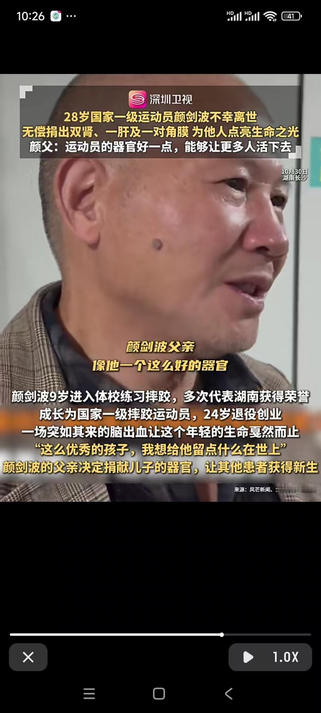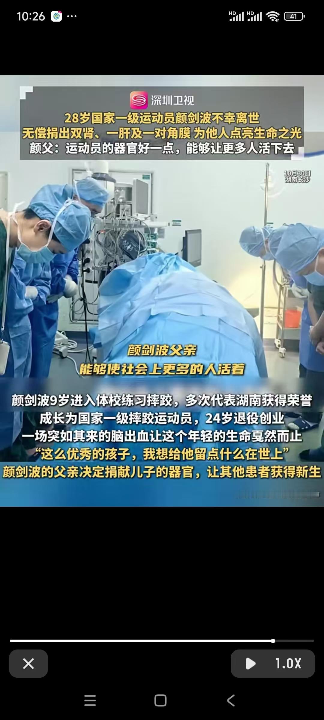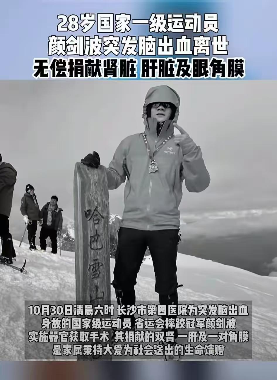 突发讣告!他于2025年10月30日去世,年仅28岁,令人惋惜! 有时候真的感叹生命太匆匆,人的一生大概能活2万到3万天,但是又有多少人能够走到生命的终点。 每次看到年轻生命的逝去,都会止不住的潸然泪下。 灿烂如花的生命,却如流星一般坠落,照耀出短暂的花火。 就在刚刚,体育圈又传来一则噩耗,一名年轻的摔跤运动员去世,真的令人惋惜! 据湖南日报报道:国家一级运动员、省运动会摔跤冠军颜剑波于2025年10月30日突发脑出血离世,年仅28岁。 28岁这个年龄段,正是一个人风华正茂,奋发图强的年龄段,有着大好的光明前途,没想到却被疾病夺去了生命,真的是令人惋惜。 翻看了一下颜剑波的履历,真的是十分优秀。 颜剑波,1997年生人,湖南邵阳人,从小便很有运动天赋,9岁的时候便进入了体校,从事摔跤训练,凭借刻苦精神,多次在国家级赛事中取得优异成绩,最终成为国家一级运动员。平日里训练十分刻苦,训练期间曾因肋骨骨折、习惯性肩关节脱臼等伤病,但是他总是报喜不报忧,很少向家人提及这些。 颜剑波曾经获得过湖南省运会摔跤冠军,并且多次代表湖南站上,国家级赛事的赛场,并获得多项荣誉,慢慢的成长为国家一级摔跤运动员。 运动员的事业生涯真的是十分短暂,天天打比赛,留下一身伤病,真的是在所难免。 颜剑波在24岁,便已经退役,退役之后,回到了湖南长沙,选择创业。 这位小伙子真的是一个善良的人,平日里十分热衷于公益,待人也很真诚,十分孝顺父母。 长得也是又高又帅,没想到年纪轻轻的,便匆匆离世,真的是令人痛心。 看到官方发布的视频,视频中母亲送别儿子最后一程,哭的是泣不成声,这种白发人送黑发人的痛楚,恐怕是世界上最残忍的事情。 颜剑波在去世之后,他的家人选择用另外一种方式,完成人生最后一次“救死扶伤”,无偿捐出双肾、一肝及一对角膜,为他人点亮生命之光。 就像颜剑波的父亲所说,运动员的器官好一点,能够让更多人活下去,让生命得到延续。 10月30日清晨6点,长沙市第四医院为颜剑波实施了器官获取手术。 颜剑波的生命虽然短暂,但是却活得精彩,活得光芒万丈,生前便是一个善良拼搏的好青年,死后还发挥最后一点余热,为更多的人带来了生的希望。 不光颜剑波是善良的,他的父母也是善良的,更是一个有大爱的人,选择将儿子的器官无偿捐献,可以救5个人,他的父母是伟大的人。 生命的价值,不在于长度而在于宽度。 希望这位帅哥一路好走!