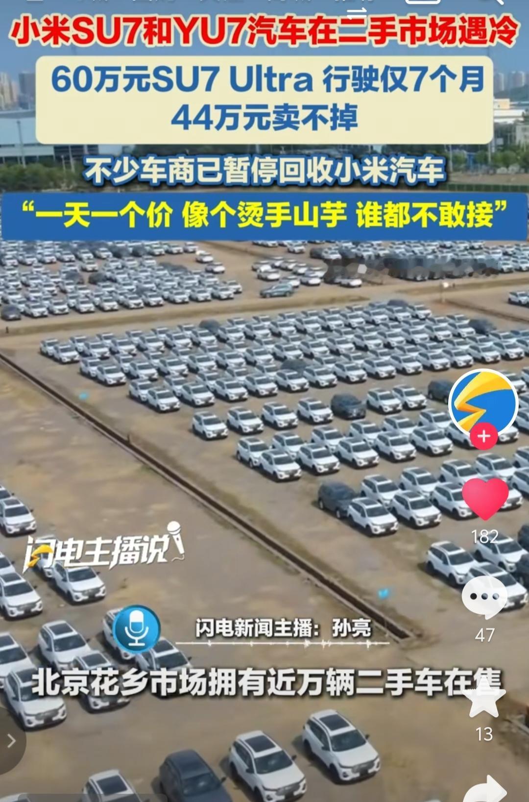 现在那些回收二手小米汽车的人,他们趁着小米汽车大火之时,回收了非常多的小米汽车。但是现在小米汽车的口碑崩了,开了半年多的60万小米汽车,现在44万都没有二手汽车商接手了。 要知道这些二手汽车商之前回收了非常多的小米汽车,本想着卖出去一辆小米汽车,他们至少能挣个几万块。可是现在好了,不仅一辆卖不出去,可能还要全部砸手里了,一辆就至少亏几十万,要是几十辆都卖不出去的话,那不是亏几千万了。 回收的这些小米汽车,真的可能卖不出去了,就算半价可能都没有人接手。原因很简单,拿个二三十万可以买辆技术非常成熟的老品牌豪车了,为何要拿两倍的钱去买辆过度营销的汽车呢。