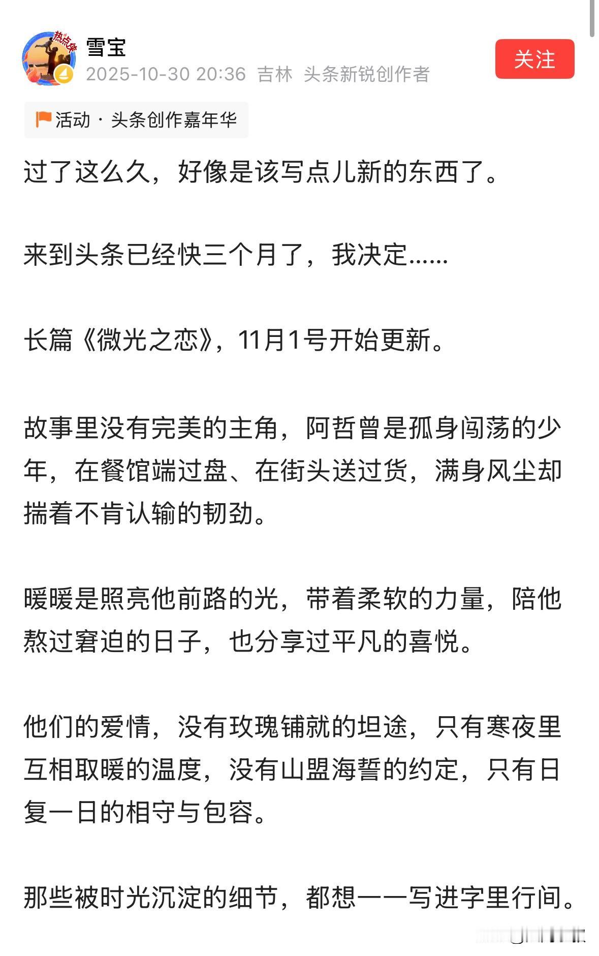 有大事喽 素老三儿子——雪宝爸爸 宣布要写长篇了 名字叫《微光之恋》 连大体的故事框架都列好了 内容应该写的就是他与V姐的爱情故事 这说明人家早就在布局长篇创作了 看看这文字的把控力 哪像一个没读过多少书的人 最近大家都在议论素老师给儿交社保 纠结儿子算不算“啃老”那点事 竟无形中激励了雪宝爸爸 不争馒头争口气 谁又知道雪宝爸爸早就开始默默努力 一步一步走出一条自己的路 给我们看了呢 真的是青出于蓝而胜于蓝 素老三将自己的亲身经历都写成小说 如今儿子也要把自己的故事写成长篇了 突然觉得 如果父母不能保证孩子将来是什么样 不如先努力让自己成功 为孩子铺一条可以模仿 可以追随的路