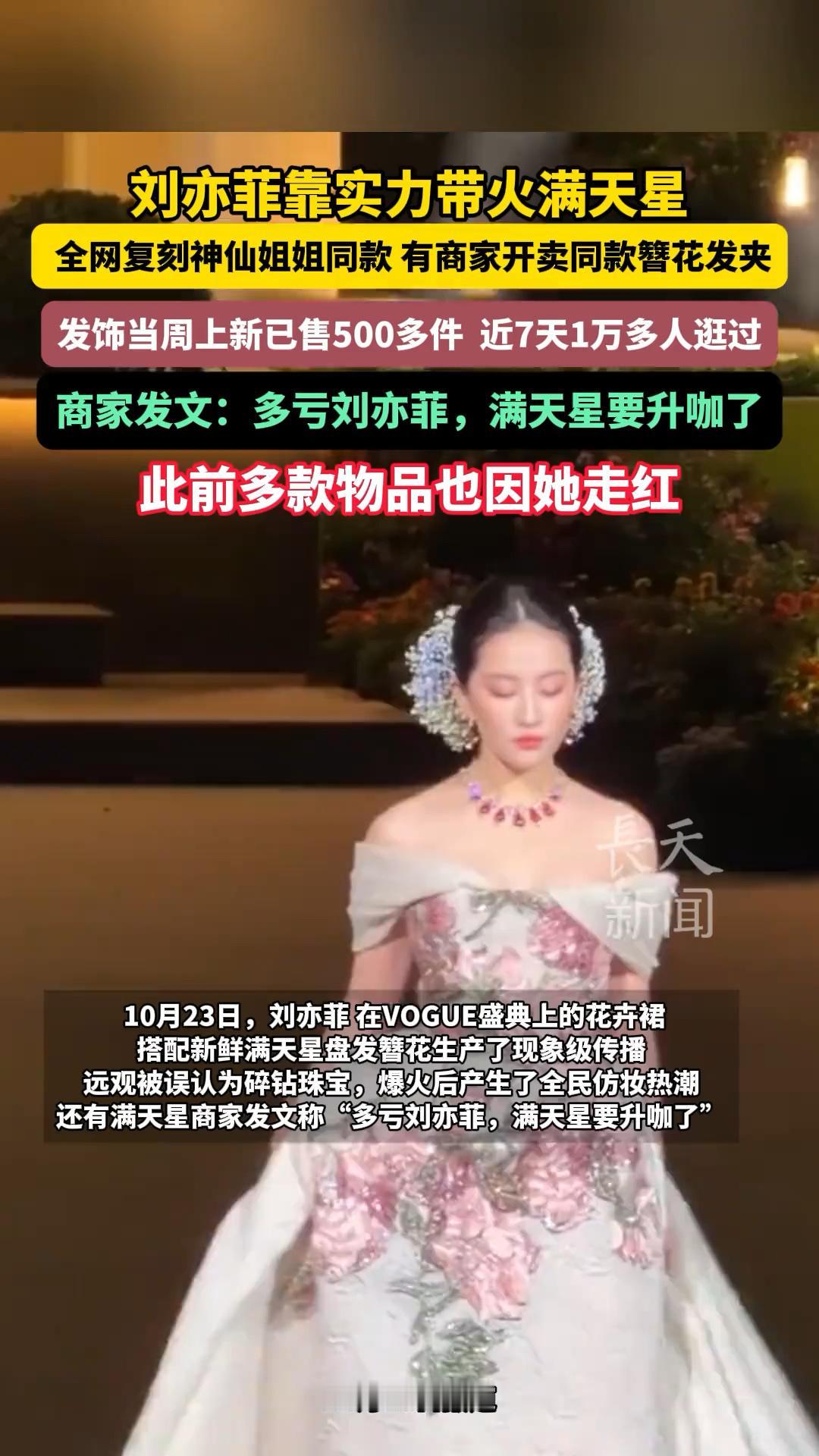 刘亦菲靠实力带火满天星,全网复刻神仙姐姐同款,有商家开卖同款簪花发夹。 发饰当周上新已售500多件,近7天1万多人逛过。商家发文:多亏刘亦菲,满天星要升咖了。此前多款物品也因她走红。 10月23日,刘亦菲在VOGUE盛典上的花卉裙搭配新鲜满天星盘发簪花生产了现象级传播,远观被误认为碎钻珠宝,爆火后产生了全民仿妆热潮。还有满天星商家发文称"多亏刘亦菲,满天星要升咖了"。 10月29日报道,天星仿真花头饰发夹后,满天星发饰刘亦菲同款。电商平台已上架刘亦菲同款满天星仿真发饰,"一对装"售价在14元至50元不等。发饰当周上新已售500多件,近7天1万多人逛过。而这并非她首次创造"带货奇迹",此前多款物品因她走红。 《去有风的地方》让荔枝玫瑰热销,更带动大理旅游收入达384亿元。《玫瑰的故事》里,她穿的黄色冲锋衣反季售罄,剧中黄玫瑰、平衡木戒指等均被抢空。