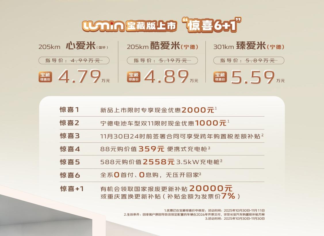 【惊喜价4.79万元起,Lumin宝藏版上市】日前,Lumin宝藏版正式上市,推出3个配置,惊喜价为4.79-5.59万元。 设计上,新车的造型进行了升级,尤其是前脸新增DIY装饰条,用户发挥的空间很大。而充电口一体化布局,使用更方便。此外,全新设计的轮毂盖,也比较有意思。空间上,新车的长宽高为3293*1700*1545mm,轴距为1980mm,且放倒后排座椅后,可拓展至804L,日常出行没啥问题。 内饰提供了水墨色与鎏金棕两种不同风格,方向盘左下按钮冷光显示,仪表台覆盖细腻荔枝纹,高级感有所提升。当然,像什么10.25英寸智控大屏、手机热点、手机互联、手机APP远程控制空调、车机端预约充电等都给安排到位。 值得一提的是,该车还新增刹车辅助、牵引力控制、车身稳定系统、坡道辅助、自动驻车等功能,全面提升行车安全。至于动力以及电池,新车标配了集成电机,采用由宁德时代、国轩高科等提供的磷酸铁锂电池。而全新升级的ECO+驾驶模式,能量回收更高效。 小结一下,9月份,Lumin单月销量来到了2.3万辆,稳居微型电动车市场第一阵营。此番,宝藏版的推出,产品力进一步升级,将进一步巩固其在细分市场的地位。【来自懂车帝车友圈】