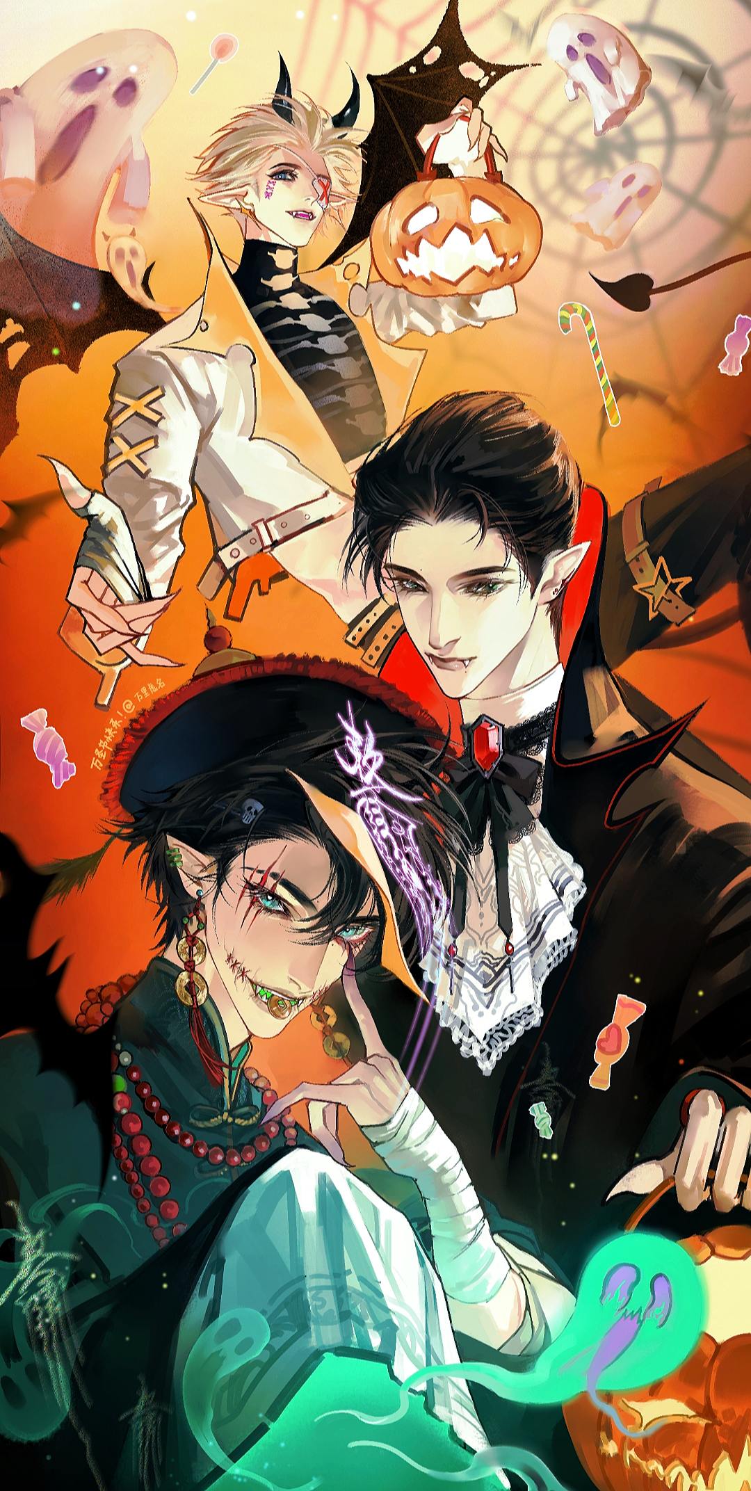 欢迎来到——万圣狂欢夜🎃!oc 万圣节快乐~终于给孩子们摸了张像样的贺图,从下到上依次谢不知 孟青 鹤欢泊 ,还有人记得小谢吗☝🏻️(都画了特效妆,所以和本来的样子差的比较多)