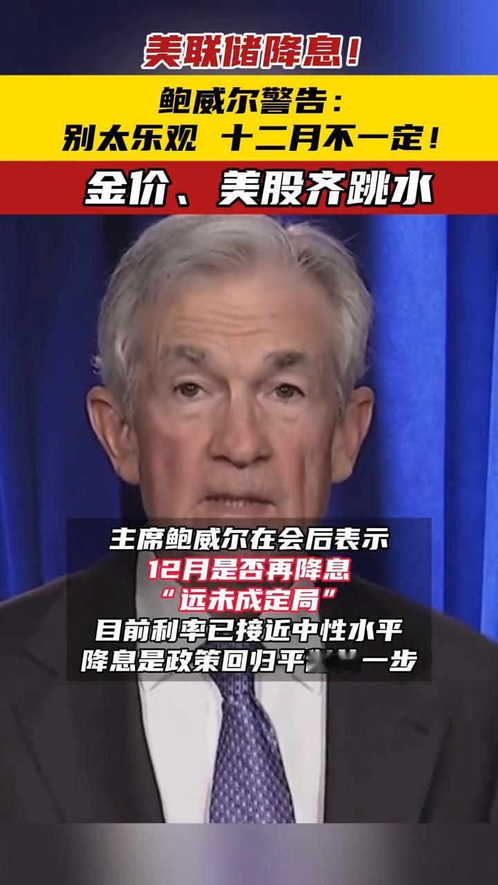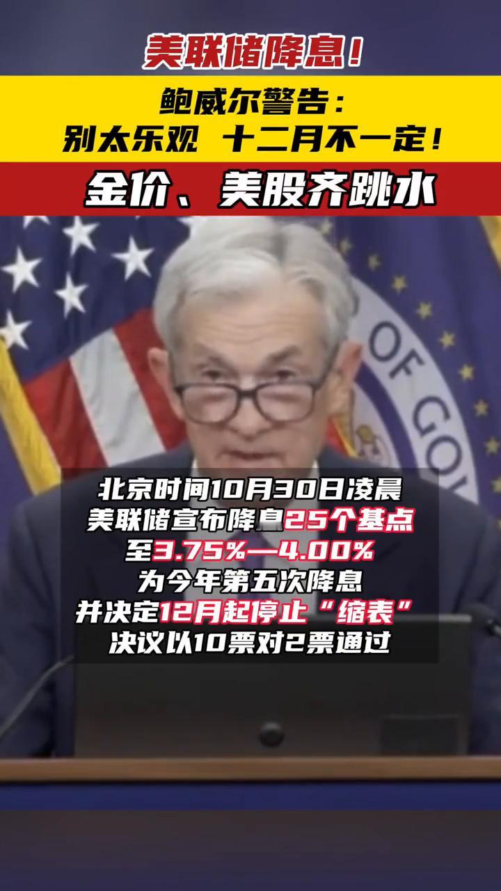 美联储降息!鲍威尔警告:别太乐观,十二月不一定!金价、美股齐跳水。 北京时间10月30日凌晨,美联储宣布降息25个基点至3.75%-4.00%,为今年第五次降息,并决定12月起停止"缩表",决议以10票对2票通过。主席鲍威尔在会后表示,12月是否再降息"远未成定局",目前利率已接近中性水平。 降息是政策回归平衡的一步,他指出市场流动性趋紧是停止缩表的原因。AI与数据中心投资正成为经济新动力,但AI相关裁员可能影响就业。鲍威尔言论引发市场震荡,美股盘中跳水,道指跌0.16%,标普500持平,纳指涨0.55%创历史新高,英伟达涨约3%,市值突破5万亿美元,苹果市值首次收盘超4万亿美元,黄金则短线走弱。美联储降不降息 美联储 美联储利率决定 美囯降息 美国金价 美联储减息