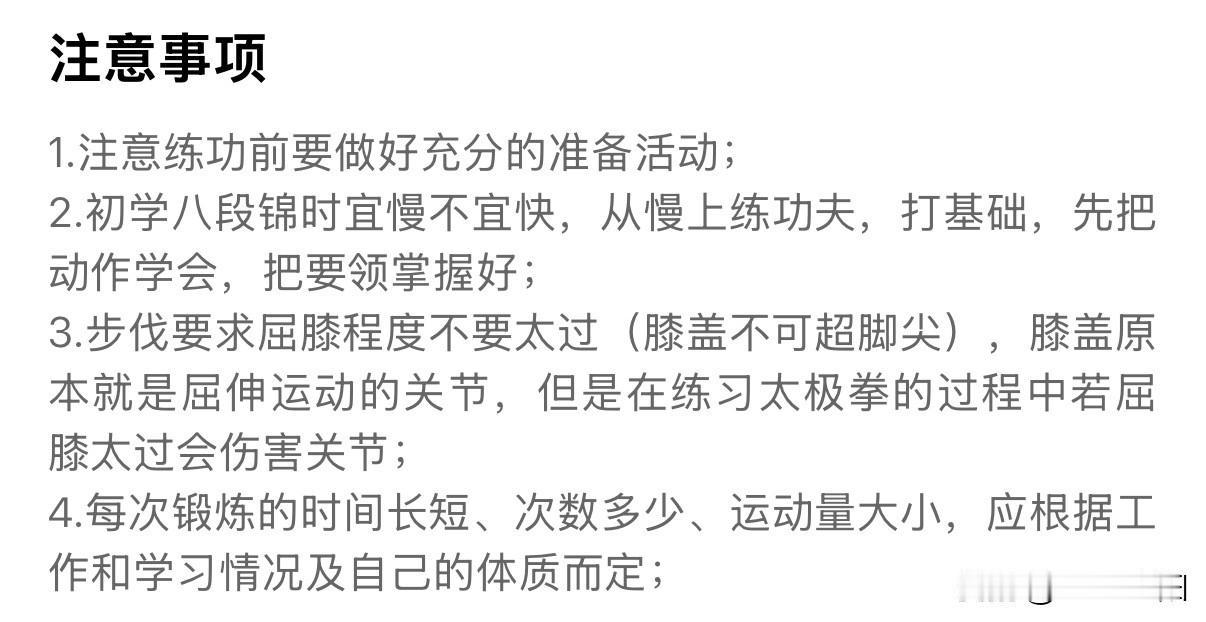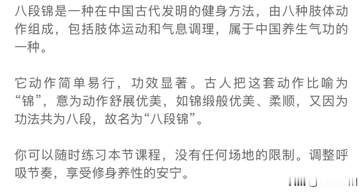 🍂秋冬的到来,气温越低越低,大家运动锻炼的意愿也随之下降;八段锦 运动锻炼 强烈推荐大家早上起来后喝杯温水,温润喉咙和肠道,然后练习《健康养生八段锦》,通过不同方式的肢体活动,灵活关节,调理气息~ 《八段锦》:属于中国养生气功之一,动作简单易行,功效显著,可以很好的激活身体,尤其对于“气血不足”的人群很有效果。 [灵光一闪]还等什么?快去试试吧!