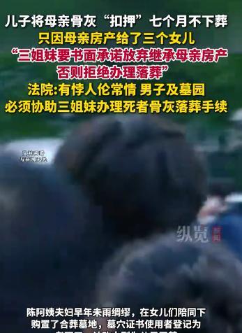 上海一男子给母亲办丧事时才知道,母亲数百万的房产只给了3个女儿,他这独子一毛钱没捞到。盛怒之下要求姐妹们放弃房产,遭拒后竟将老母骨灰扣留,不准下葬…… 秋日的墓园里,银杏叶落在黑色墓碑上,三姐妹蹲在合葬墓前,指尖轻轻拂过碑上“陈秀兰”的名字。 这场闹剧的起点,藏在2022年深秋的灵堂里,陈阿姨走得突然,糖尿病并发症发作,没几天就没了意识。 三个女儿轮流守在医院,王某是最后一个赶过来的,进门时还提着没拆封的烟酒,说“等妈醒了给她补补”。 灵堂搭在小区活动室,黑白遗照里的陈阿姨穿着蓝布衫,笑纹里还带着慈祥。 吊唁的人走得差不多时,二姐去整理母亲的遗物,翻出了公证处的信封,里面装着遗嘱。 大姐凑过来一看,手瞬间僵了:母亲名下那套位于青浦的老房子,价值近300万,明确留给三个女儿,王某没份。 王某端着水杯过来,瞥见信封上的“遗嘱”二字,一把抢了过去,白纸黑字的内容让他攥着纸的指节发白,水杯“哐当”砸在地上,水渍漫过灵堂的白菊。 大姐想解释,说母亲立遗嘱时公证处的人来了两次,确认老人思路清晰,还提到王某这些年在外地打工,都是姐妹仨轮流照顾。 可王某根本听不进去,指着三个姐姐的鼻子放话,要么现在写放弃继承的字据,要么妈就别想下葬!谁都没料到,他真会这么做。 出殡当天,王某以“要亲自送母亲最后一程”为由,从殡仪馆领走了骨灰盒,转头就回了家。 三姐妹找上门,却见他把骨灰盒锁在衣柜里,钥匙揣在兜里,房子的事没谈拢,这盒子就别想拿走。 接下来的七个月,成了姐妹仨的噩梦,她们每周都去王某家,有时带着母亲生前织的毛衣,有时拎着他爱吃的红烧肉,想好好聊聊,可每次都被赶出门。 更让她们无奈的是墓园的态度,早年父母买合葬墓时,认购人写的是王某,证书也一直在他手里。 墓园负责人说,按规定没有认购人签字,确实没法办落葬手续,二姐夜里翻来覆去睡不着,总梦见母亲站在空荡荡的殡仪馆里,问她“怎么还不让我回家”。 走投无路时,社区调解员给她们指了路,去法院吧,这不是家务事,是违法了,带着遗嘱、墓穴证书和调解员的记录,三姐妹走进了青浦区人民法院。 开庭那天,王某没来,只让律师带了句话,房产归我,就配合落葬,否则免谈。 法官没当庭宣判,而是先去了墓园和殡仪馆调查,在殡仪馆的寄存室里,法官看着陈阿姨的骨灰盒放在最上层,蒙着一层薄灰,忍不住叹了口气。 后来在判决书中,他写道,子女对父母的赡养,不仅是生前照料,更包括身后让其得享安宁,以骨灰要挟遗产,既违伦理,也触法律。 判决下来那天,三姐妹拿着判决书去王某家,他坐在沙发上,盯着判决书看了半天,突然把纸揉成一团,却没像往常一样发火。 最终,他还是拿出了墓穴证书,低声说,别让妈等太久,落葬那天,社区里不少邻居都来了。 看着骨灰盒放进父亲身边的空位,大姐突然想起母亲生前说的话,我这辈子不求别的,就想跟你爸葬在一起,孩子们好好的。 这起案子后来成了青浦区“老年人权益司法保护基地”的宣讲案例。 说到底,孝从来不是嘴上说说,也不是争多少财产。 就像陈阿姨生前最在意的,不过是“入土为安”,不过是子女和睦。