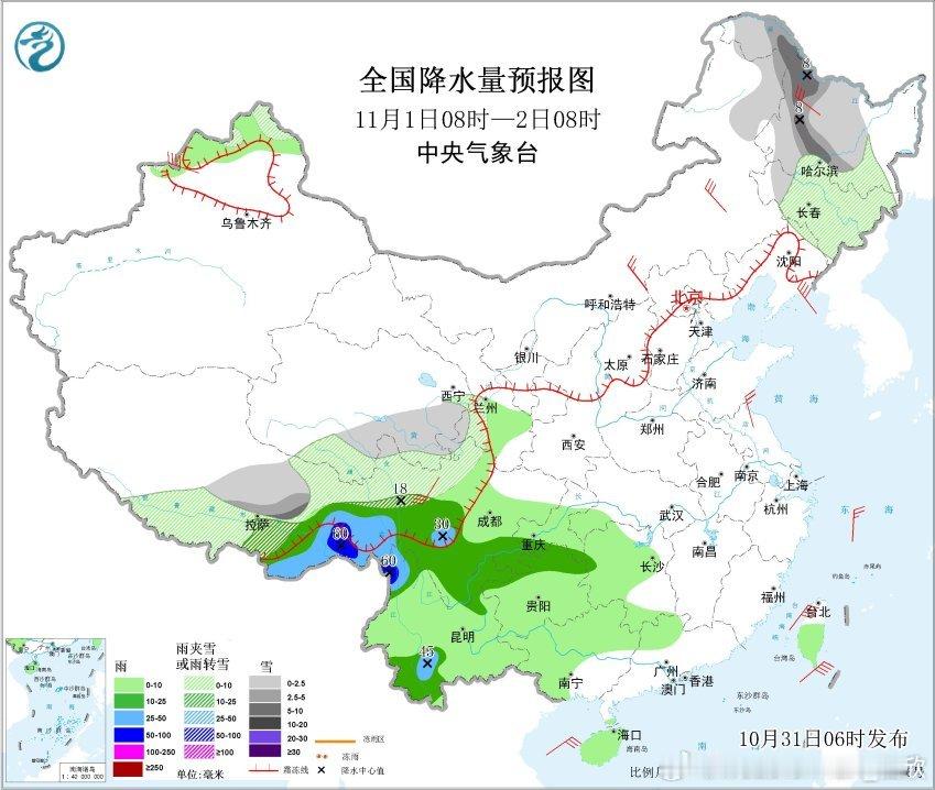 11月1日08时至2日08时,内蒙古东北部、黑龙江中西部和南部、吉林、西藏东北部和南部、青海南部、川西高原北部等地部分地区有小到中雪或雨夹雪,其中,黑龙江西部等地局地有大雪(5~8毫米)。西藏南部和东部、四川中西部和南部、贵州北部、云南北部和西南部等地部分地区有中到大雨,其中,西藏东南部、云南西北部等地部分地区有暴雨(50~60毫米)。