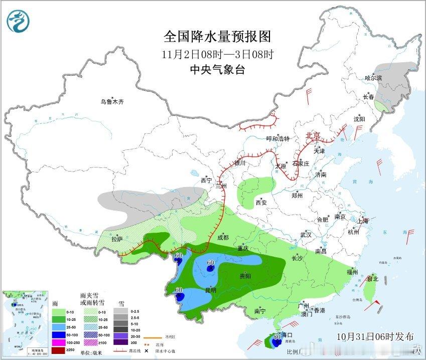 11月2日08时至3日08时,黑龙江东南部、吉林东部、西藏东部和南部、青海南部和西部、川西高原等地部分地区有小雪或雨夹雪。西藏东南部、四川南部、贵州、云南、广西北部、海南岛等地部分地区有中到大雨,其中,四川南部、云南西部、海南岛中东部等地部分地区有暴雨(50~80毫米)。