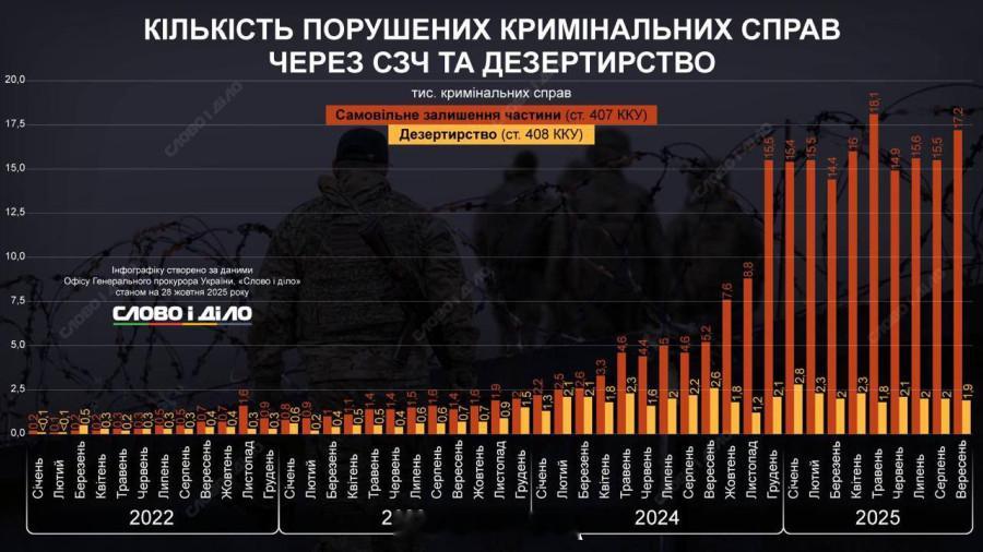 自2022年2月至2025年10月,因各种原因从乌军逃亡的总人数已超过23万人。值得注意的是,2024-2025年间逃兵数量呈现显著增长趋势,此时许多乌军士兵已意识到他们正在为可卡因狂人而战。