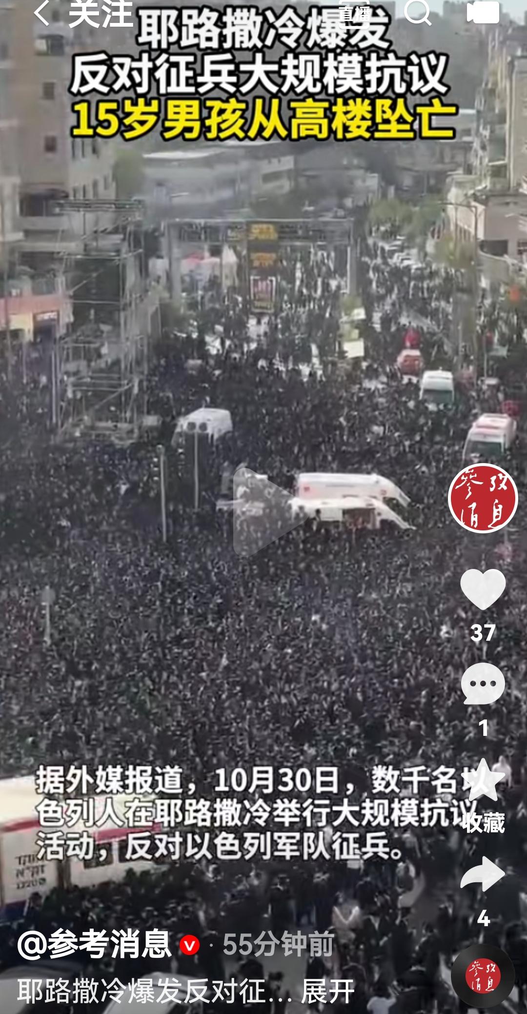 以色列爆发大规模游行示威,反对征兵 根据媒体报道,10月30日数千人以色列人在耶路撒冷举行了大规模抗议活动,反对以色列军队征兵 并且有以色列民众点燃泼油的碎片,准备自然,同时在游行示威时刻一名15岁男孩跳楼身亡 看来以色列以后就是内部出事了,让这样一个恶魔倒塌,现在一部分犹太人被以色列政府强制征兵,他们反抗很强烈以色列边境局势 以色列 巴勒斯坦反战 以色列出大事情 图片来自参考消息视频