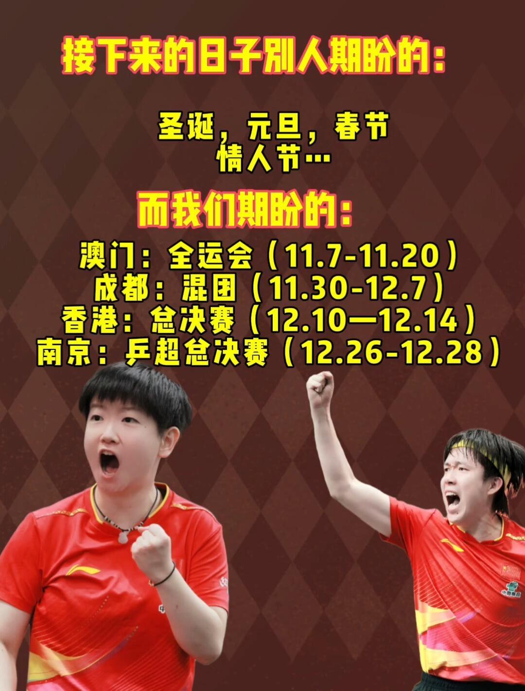 莎莎和头哥的乒乓传奇还在继续,期待的有全运会,成都混团,香港WTT总决赛,还有我们万众期待的乒超联赛,行程满满! 年前的期待值拉满,真的让人很激动,孙颖莎和王楚钦都在,“一起步入他们的幸福比赛生活!”很喜欢的两小只也是看着长大的,有种老母亲的欣慰感!