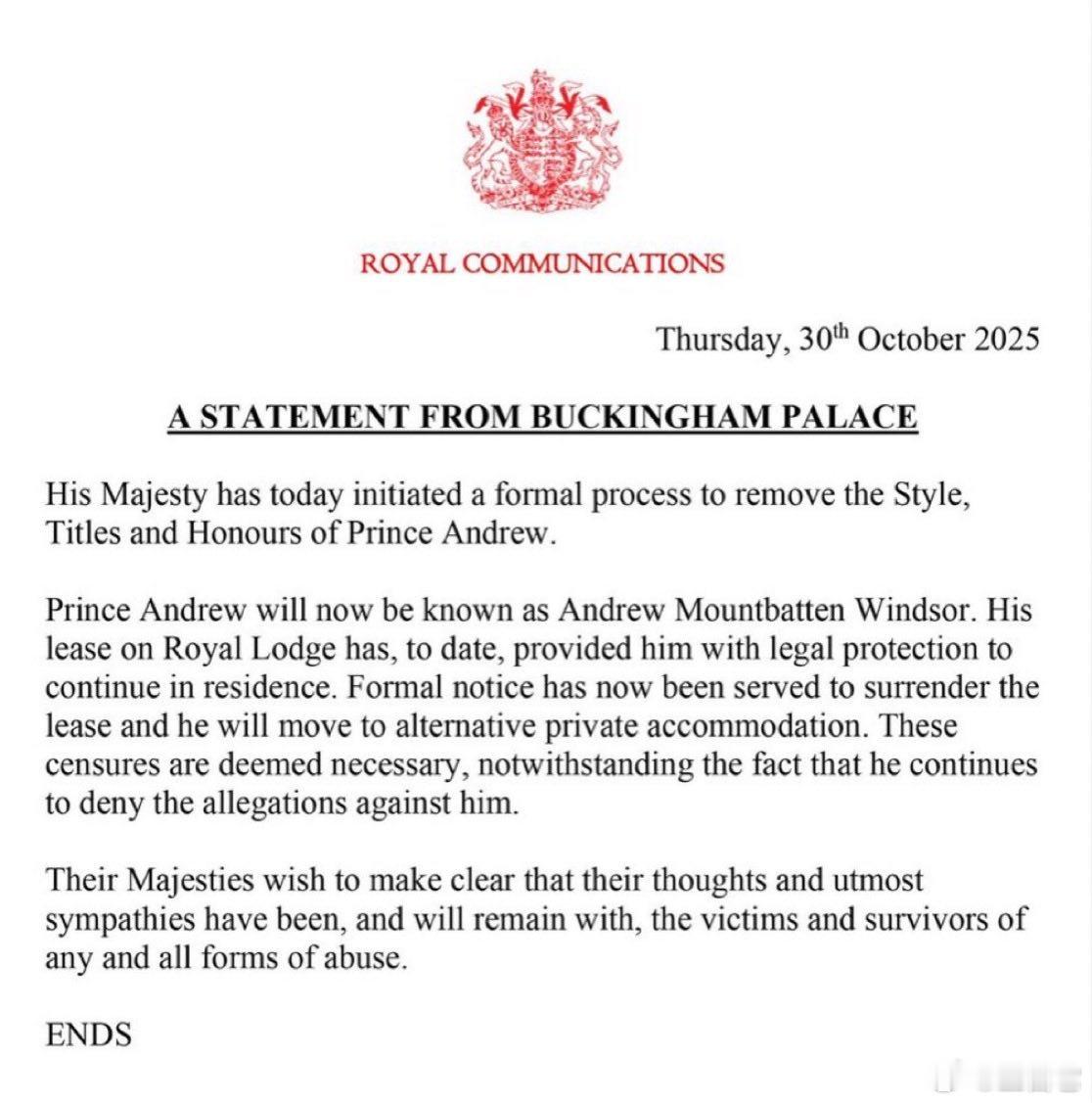 ‼️ 白金汉宫声明:安德鲁王子被剥夺了所有的王室头衔,沦为平民并被赶出王宫。
